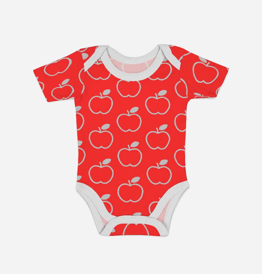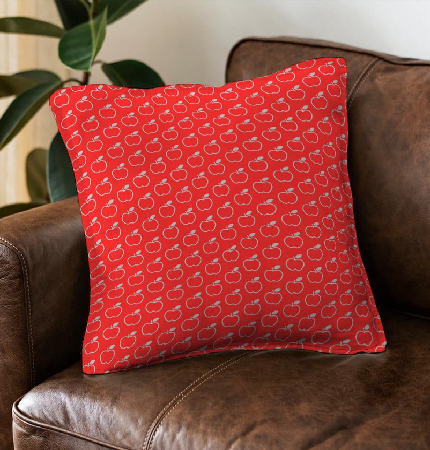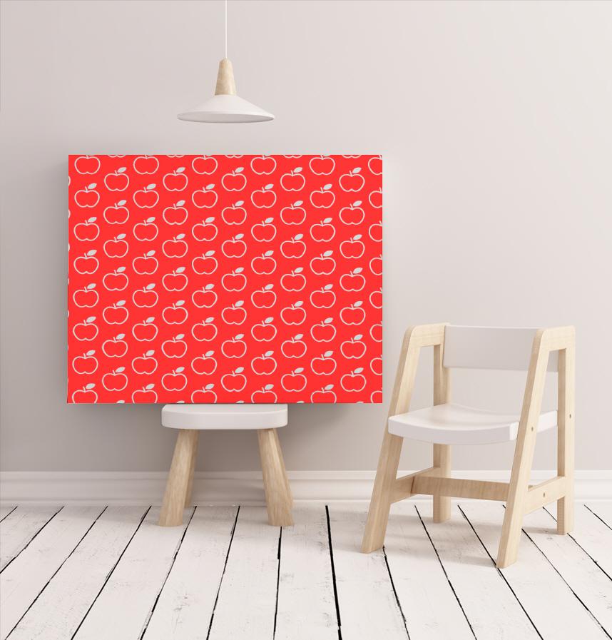 鮮やかな赤いキャンバスにミニマルなグレーのリンゴが際立つモダンなデザインで