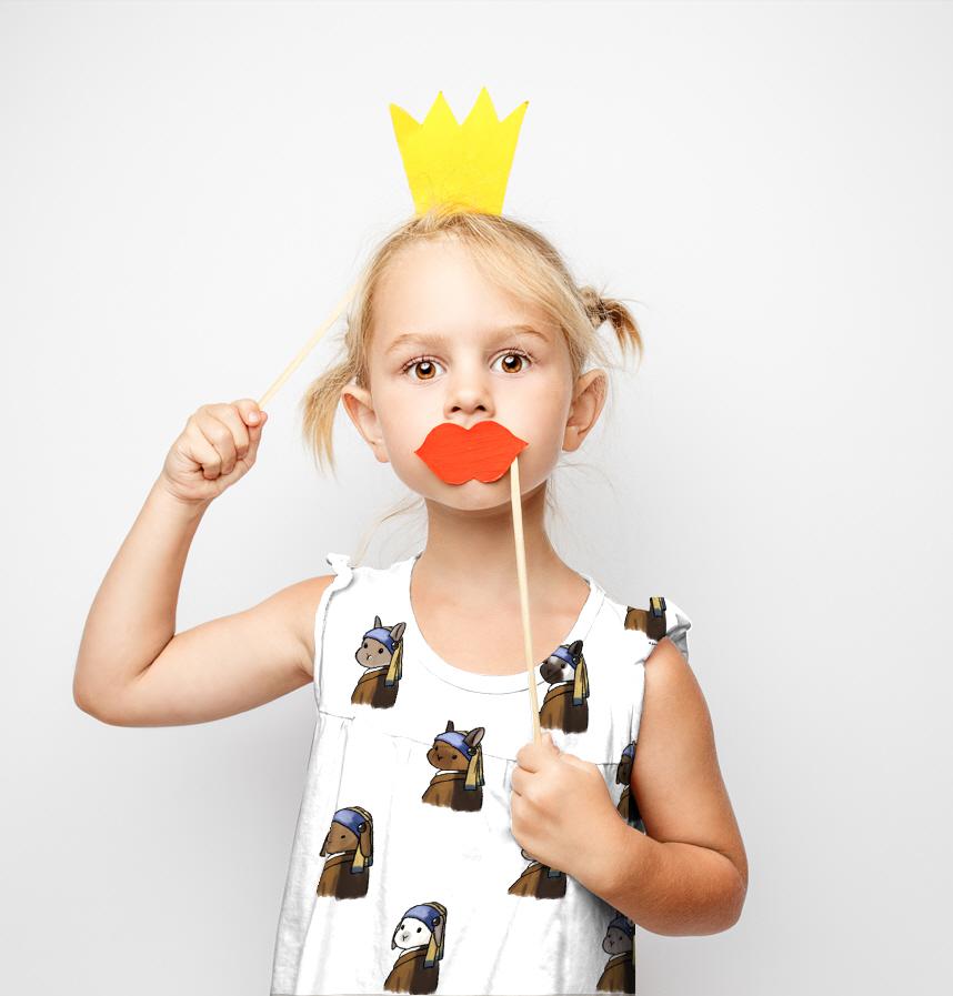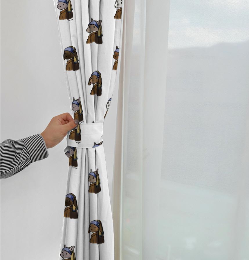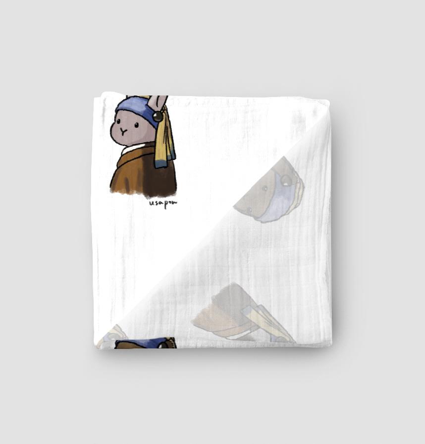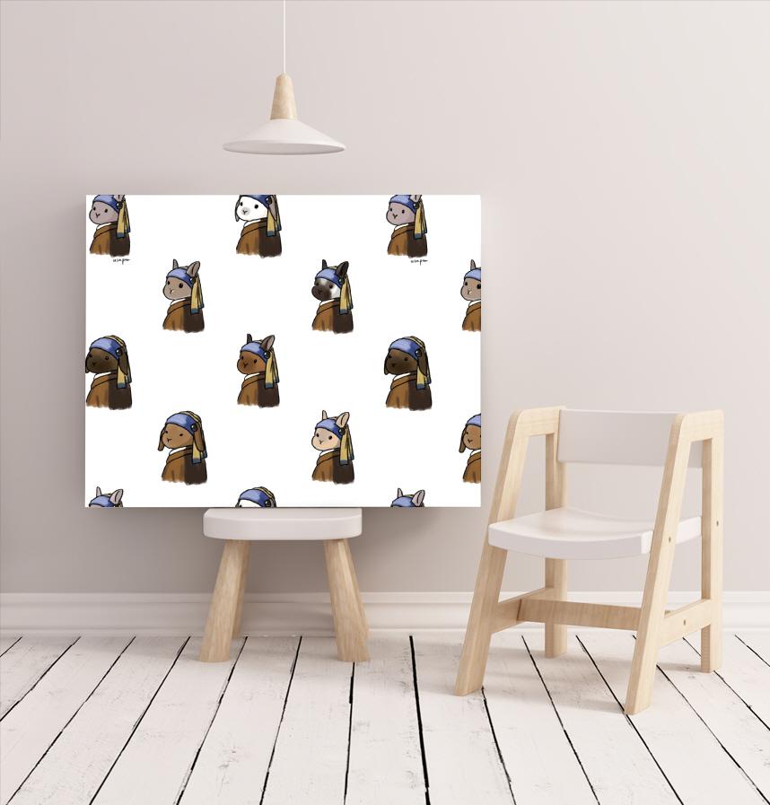 パターン説明 絵画「真珠の耳飾りの少女」風のうさぎさんイラストの総柄布地です。