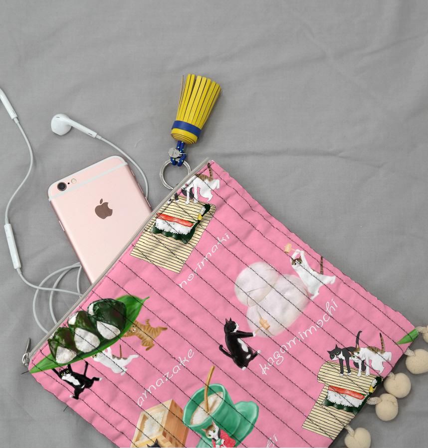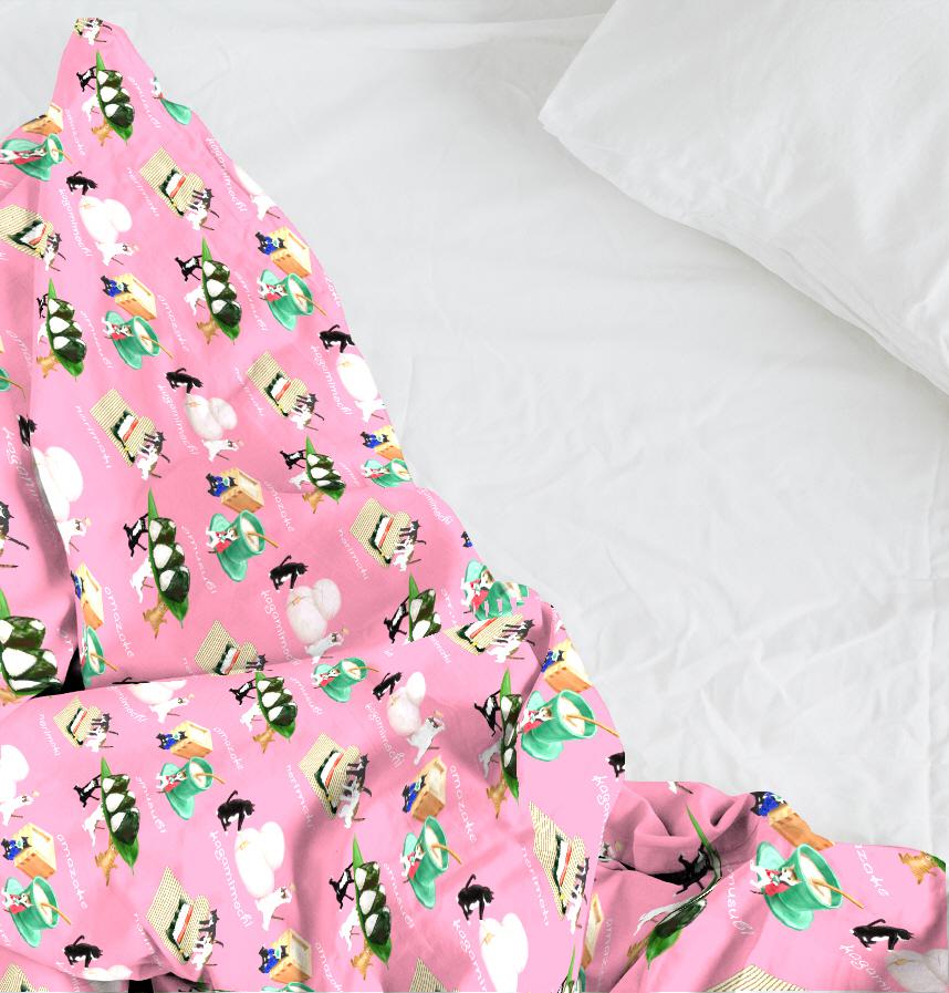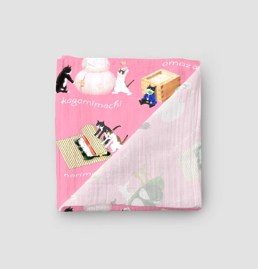 お米でできた食べ物(鏡餅・甘酒・海苔巻き・おむすび)のまわりでわちゃわちゃするちびにゃんこ達