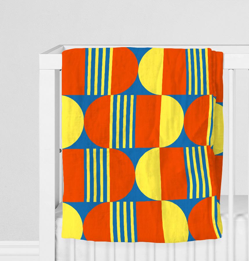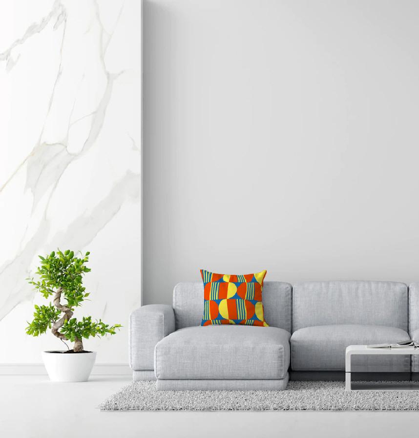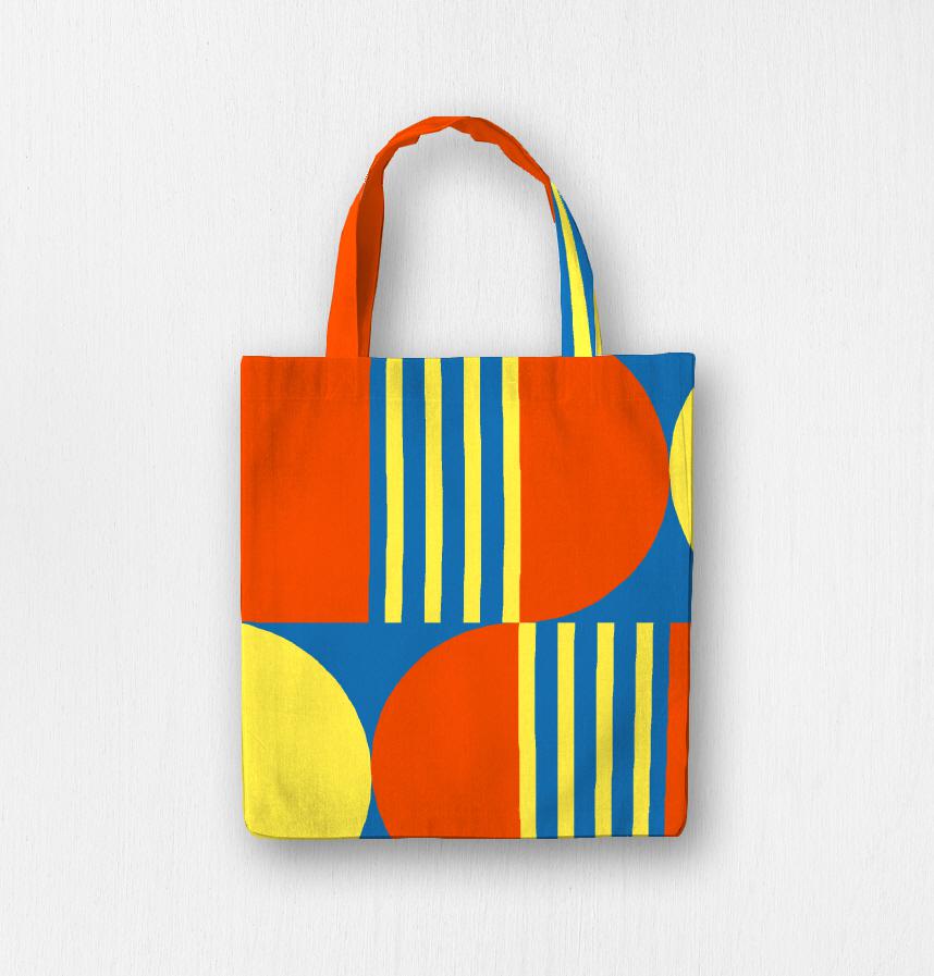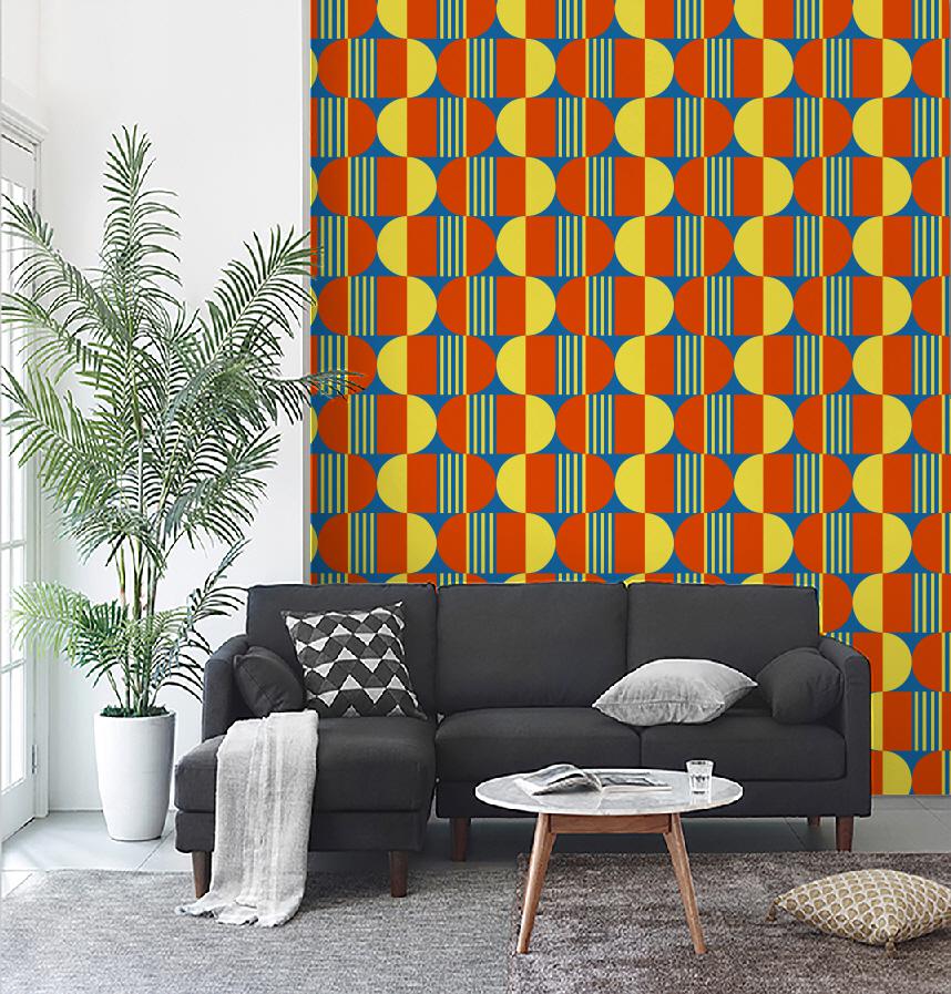 パターン説明 明るいオレンジとレモン色がストライプと円形で青いキャンバス地に対比されモダンで強烈な印象を与えるパターン