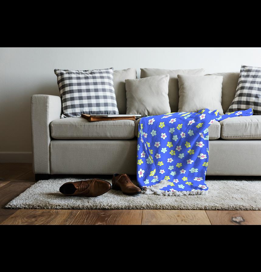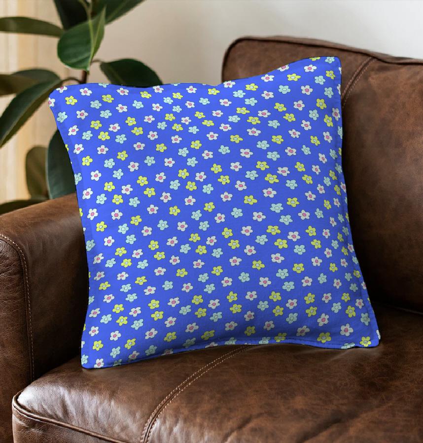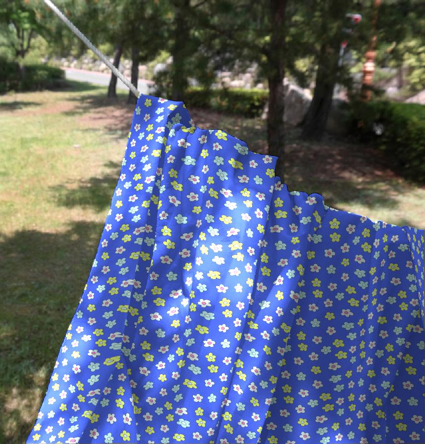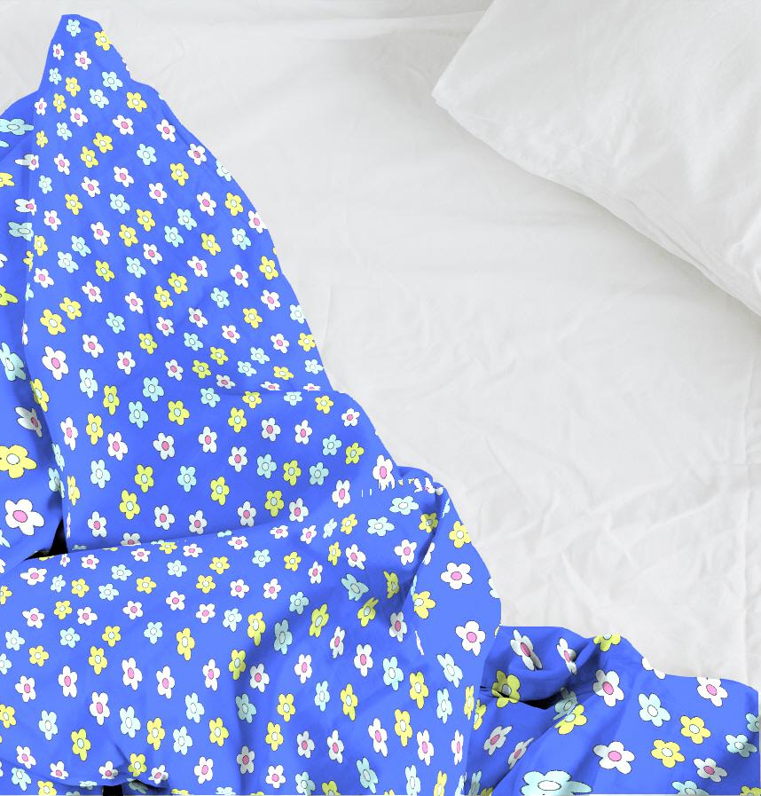 明るい青色の背景と軽やかな花柄を反映し、澄んだ空を背景に