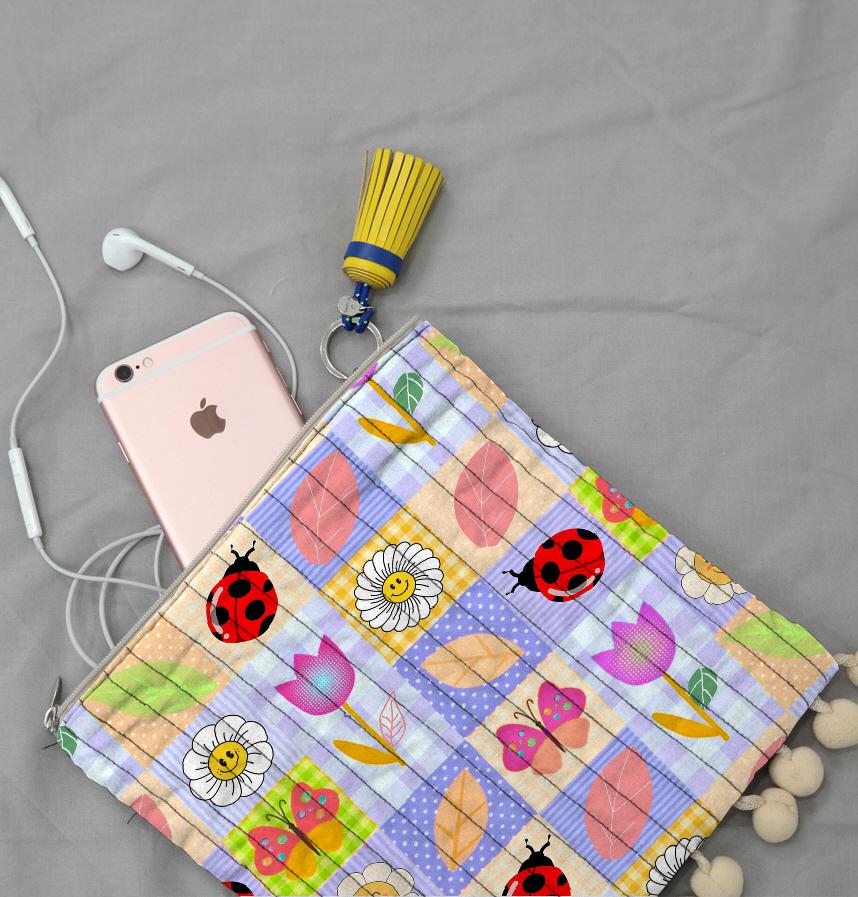 生気あふれる蝶、てんとう虫、チューリップ、葉などの要素が特徴