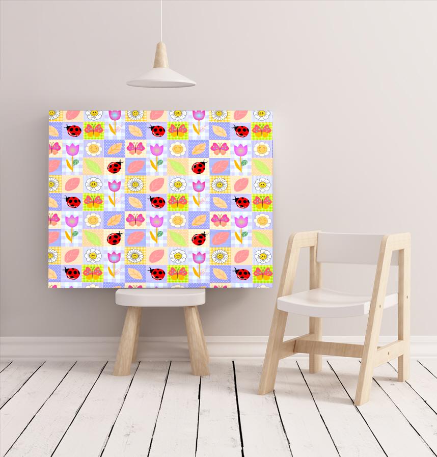 デザインはカラフルで愉快で、様々なパステル柄の背景に笑顔のデイジー、