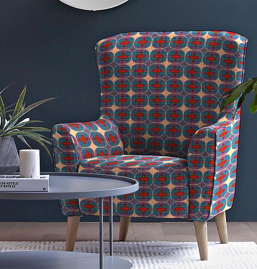 「ジオメトリックハーモニー」パターンは、精巧に配置された幾何学的図形で構成されています。各ユニットは円とダイヤモンドのジオメトリを組み合わせてバランスのとれたデザインを作り出します。主な色は青と赤の色で、互いに対比して視覚的な興味を引き起こします。円の中に位置する赤いダイヤモンドは、まるで炎のように見え、パターンに鮮やかな感触を加えます。