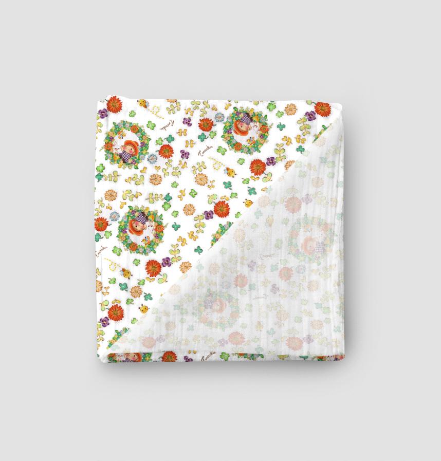 四葉のクローバーや、色とりどりのお花のリースに腰をかけ、花の香りを楽しんでいる女の子。