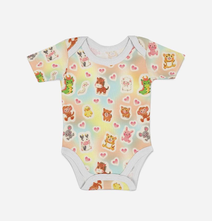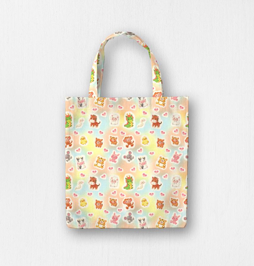 干支モチーフとハートが描かれた、あたたかみのあるかわいいデザインの布です。小物作りやインテリアのアクセントなど幅広く活用できます。やさしい雰囲気が日常に彩りを添えます。