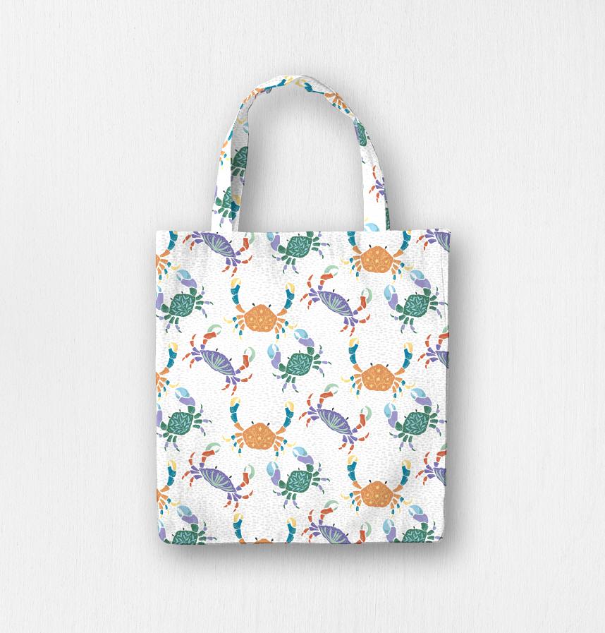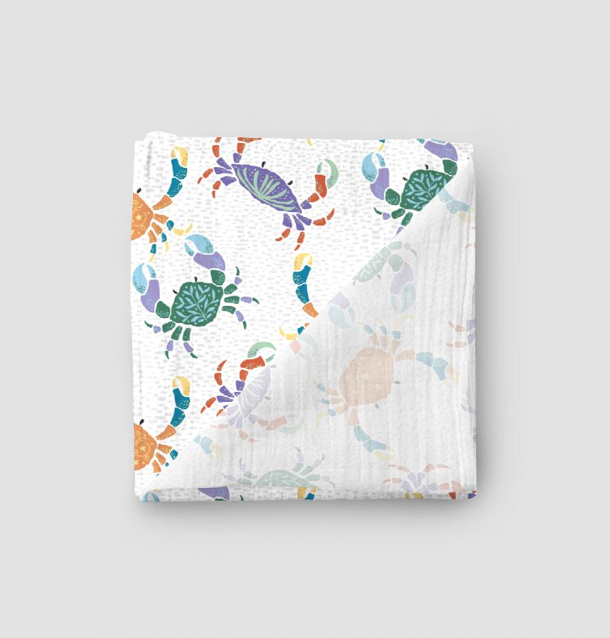 パターン説明 砂の中で遊ぶカラフルなカニたち。ブルー系とレッド系の2色展開です。
