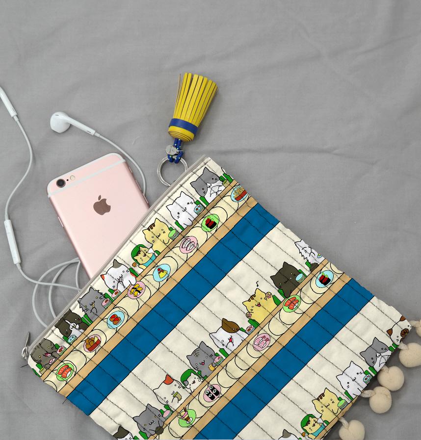 パターン説明 ネコたちがお寿司を食べている所がボーダー状に並んでいるデザインです