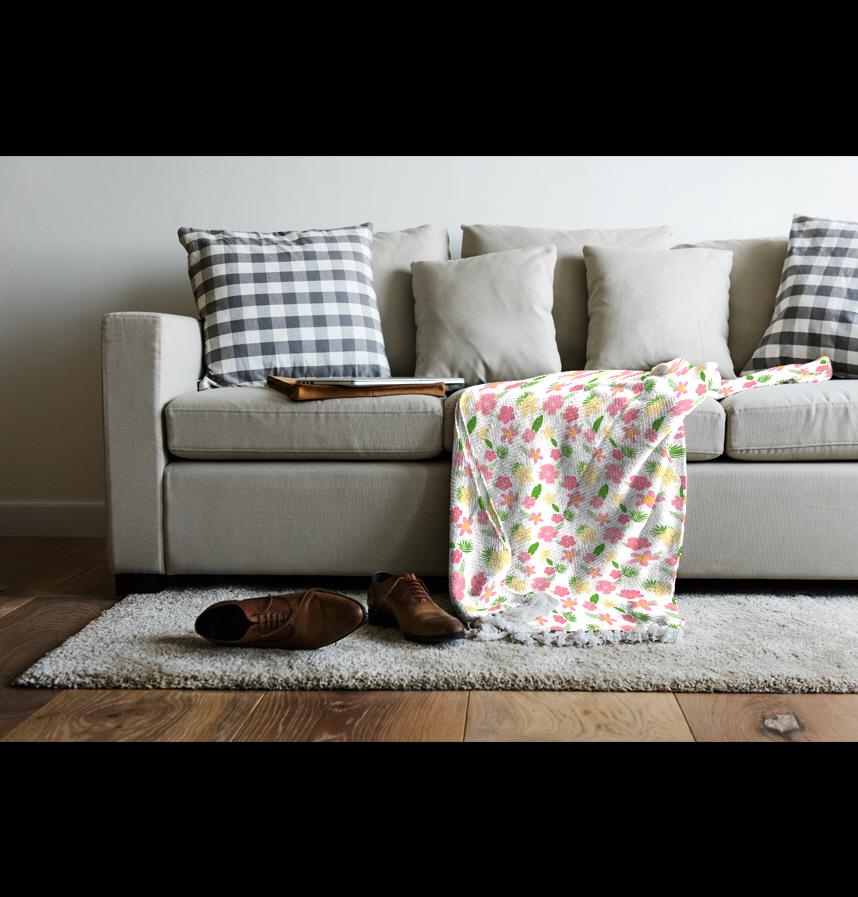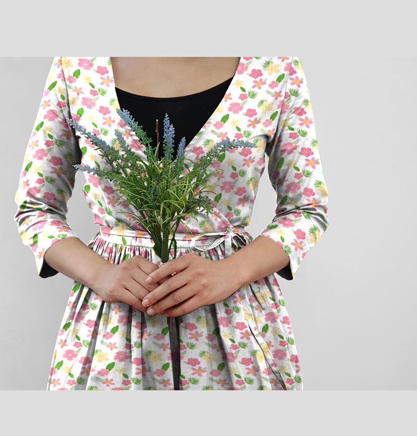 このパターンは、色とりどりの花と葉が調和し、夏の活気と活力を表現します。主にピンクと黄色の花が特徴で、明るく軽快な印象を与えます。背景は白に設定されており、花がより際立っています。