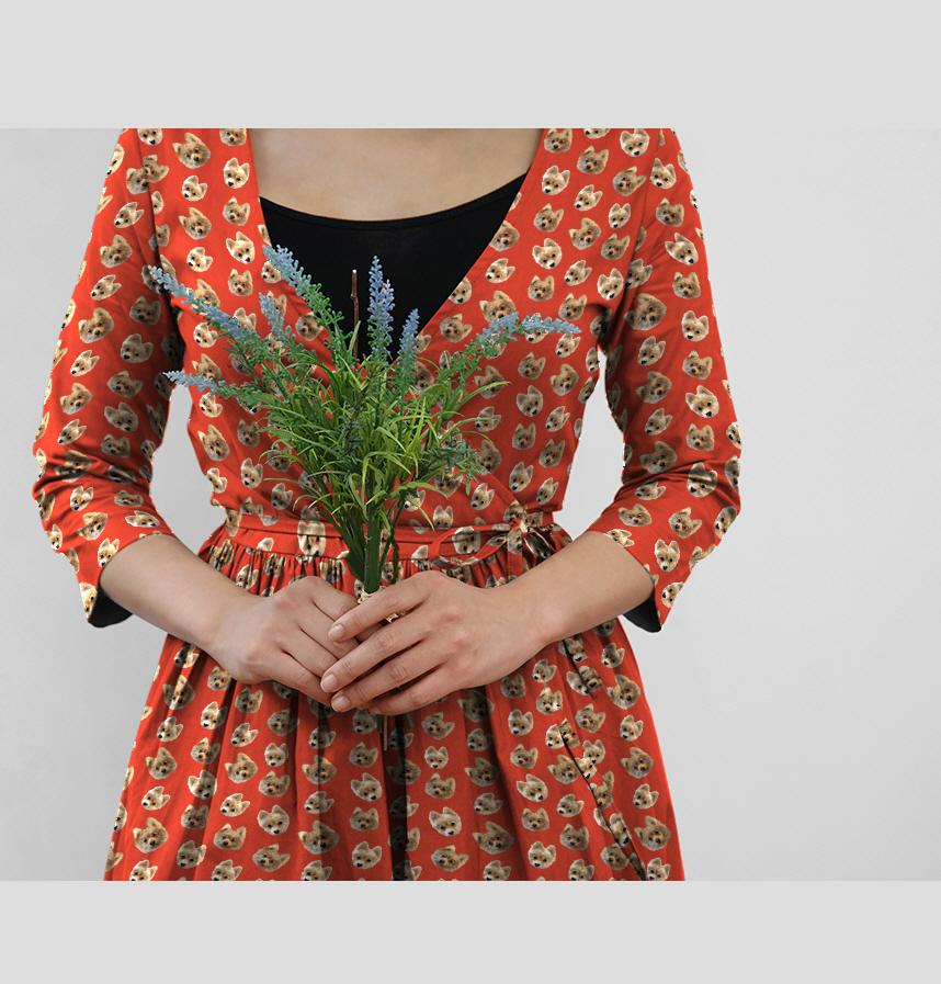 朱色と犬さんの毛色がとてもおしゃれ。浴衣にも、フレンチシックなワンピースにも可愛い。