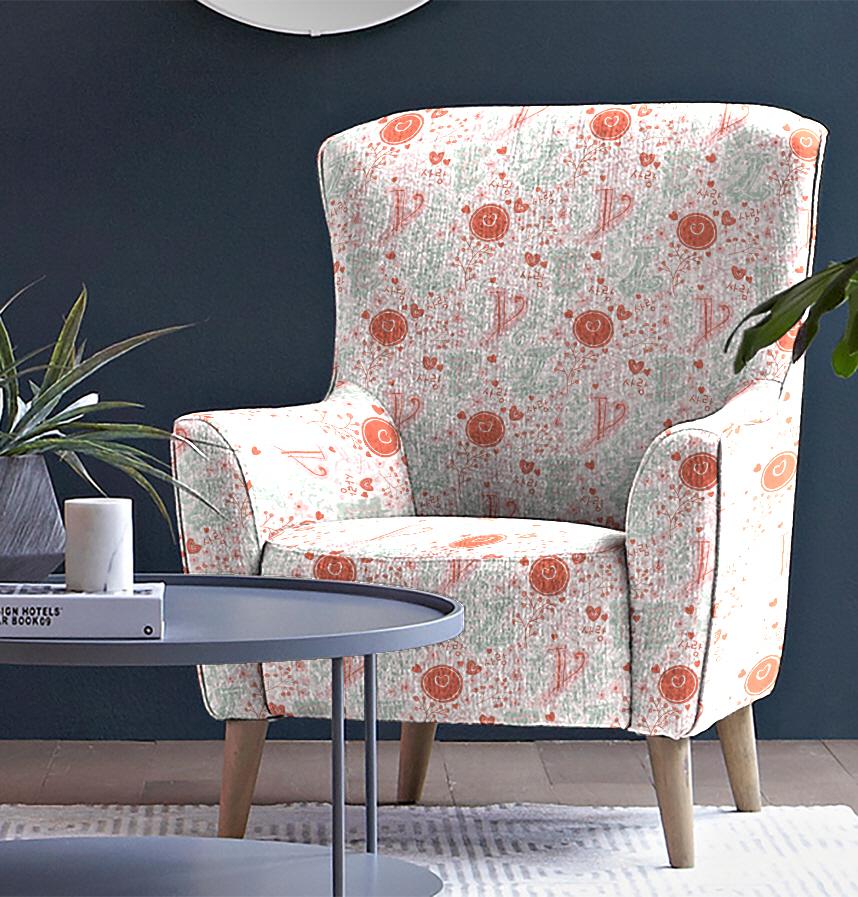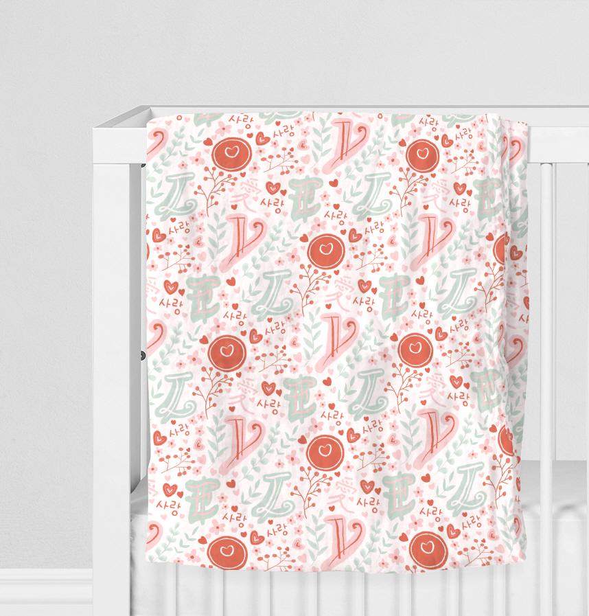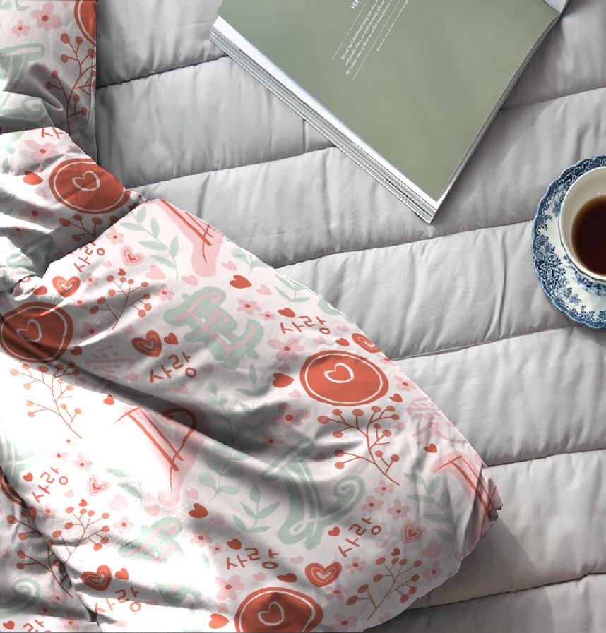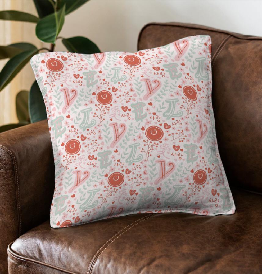 パターン1:暖かいコーラルピンクとミントグリーンが調和するロマンチックなパターンです。韓国語「愛」の文字が様々な大きさに配置されており、ハート型や花の松、木の枝などの自然要素が調和しています。中央の大きな円形モチーフの中にはハートが入っていてポイントとして機能します。