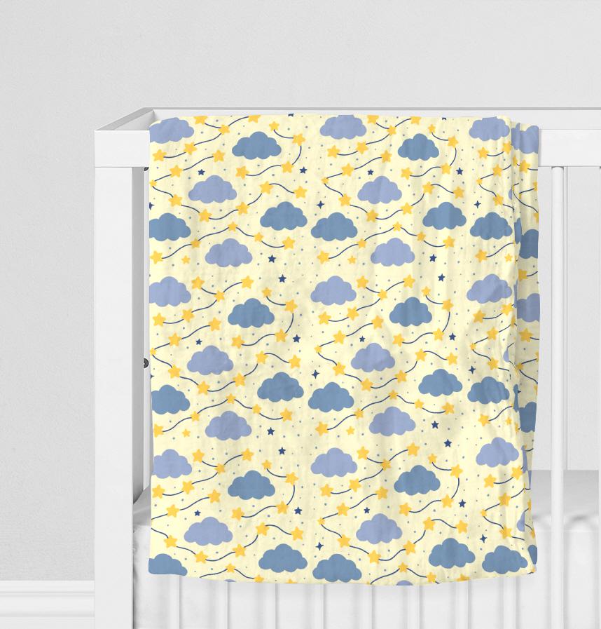 星が流れるようにつながる線の上に様々な大きさの雲が配置されており、ふわふわの夜空を思わせるデザインです。