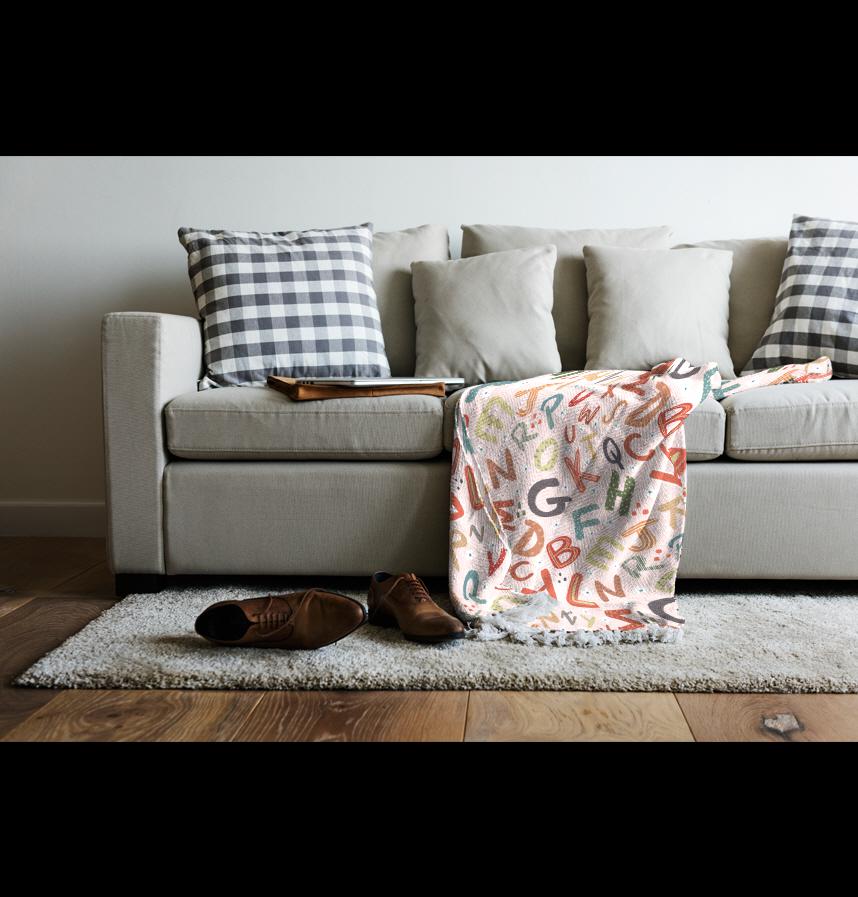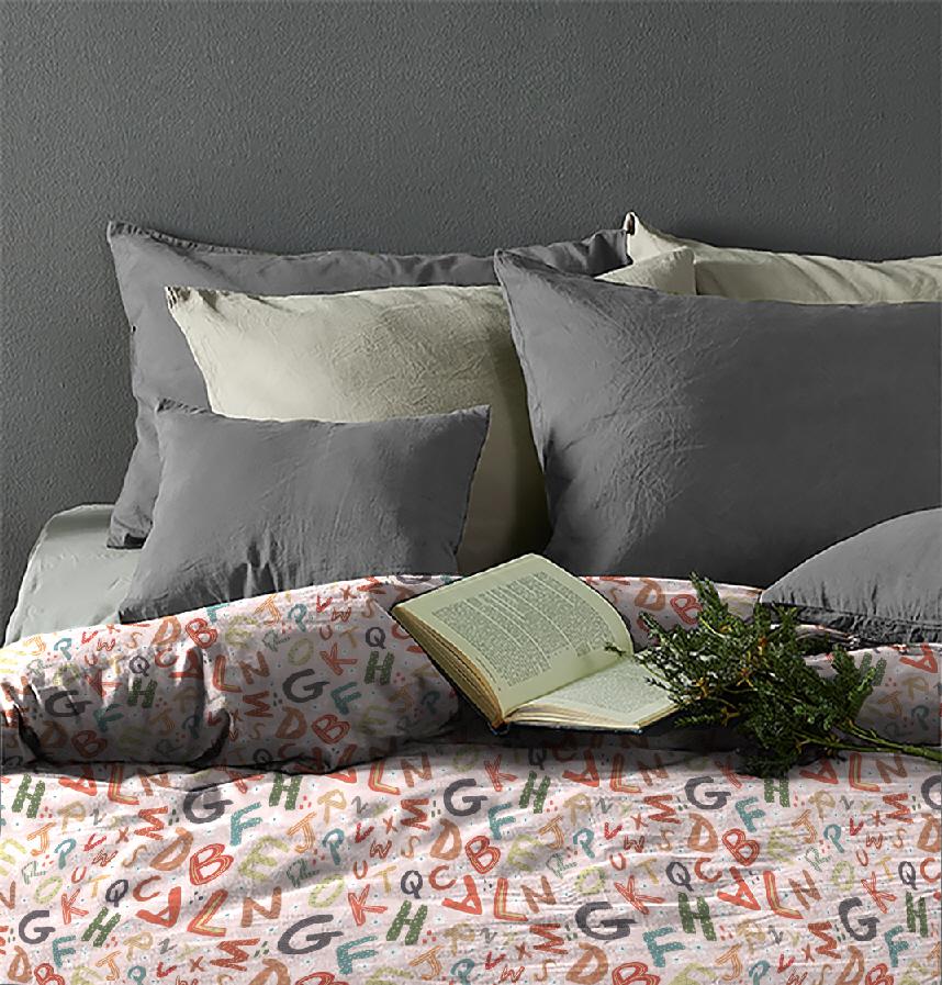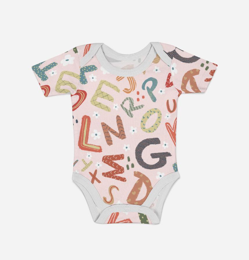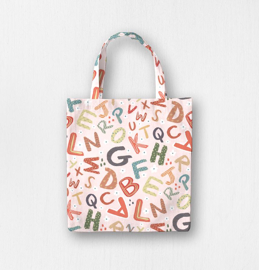手描きのような暖かい質感のアルファベットパターンで、各文字ごとに固有のパターンと色を持っています。点線、市松模様、ジグザグ、水玉模様など様々なテクスチャで飾られた大小文字が白い花と小さなドットと一緒に調和しています。全体的にヴィンテージながらモダンな感じを与えるハンドドローイングスタイルのデザインです。
