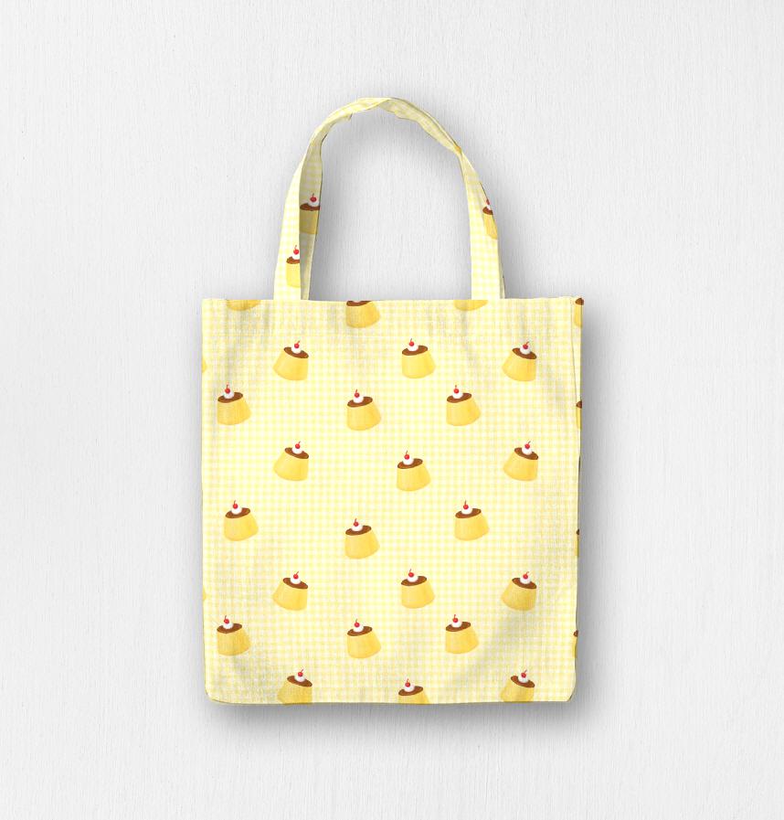 パターン説明 色鉛筆の質感で表現したチェリーがトッピングされたプリンとギンガムチェックパターン