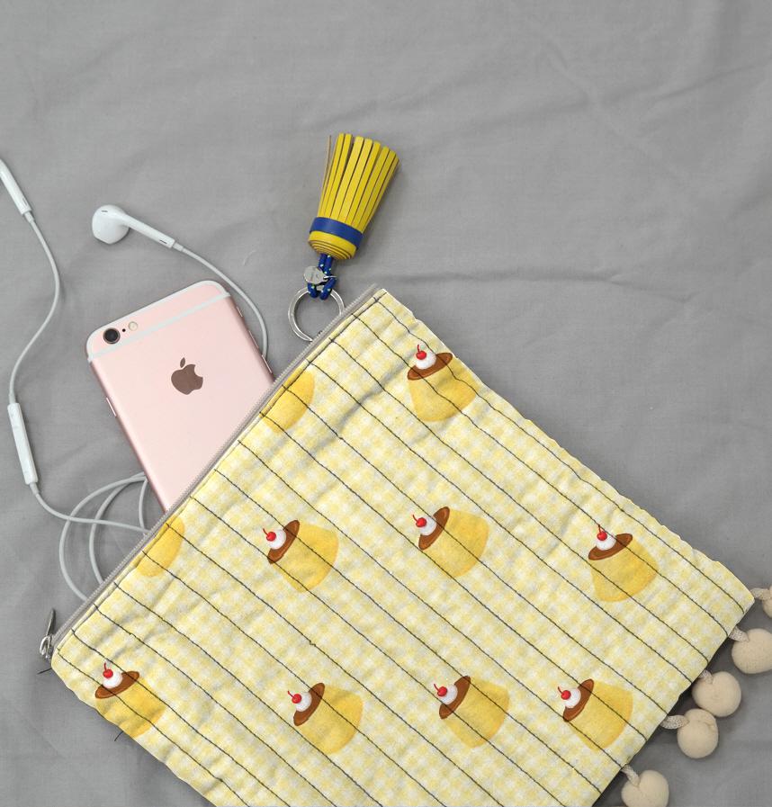 色鉛筆の質感で表現したチェリーが乗せられたプリンとギンガムチェックパターン