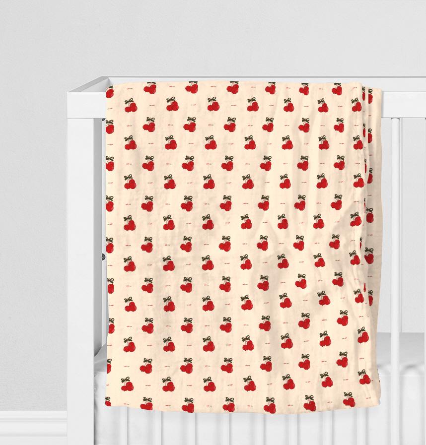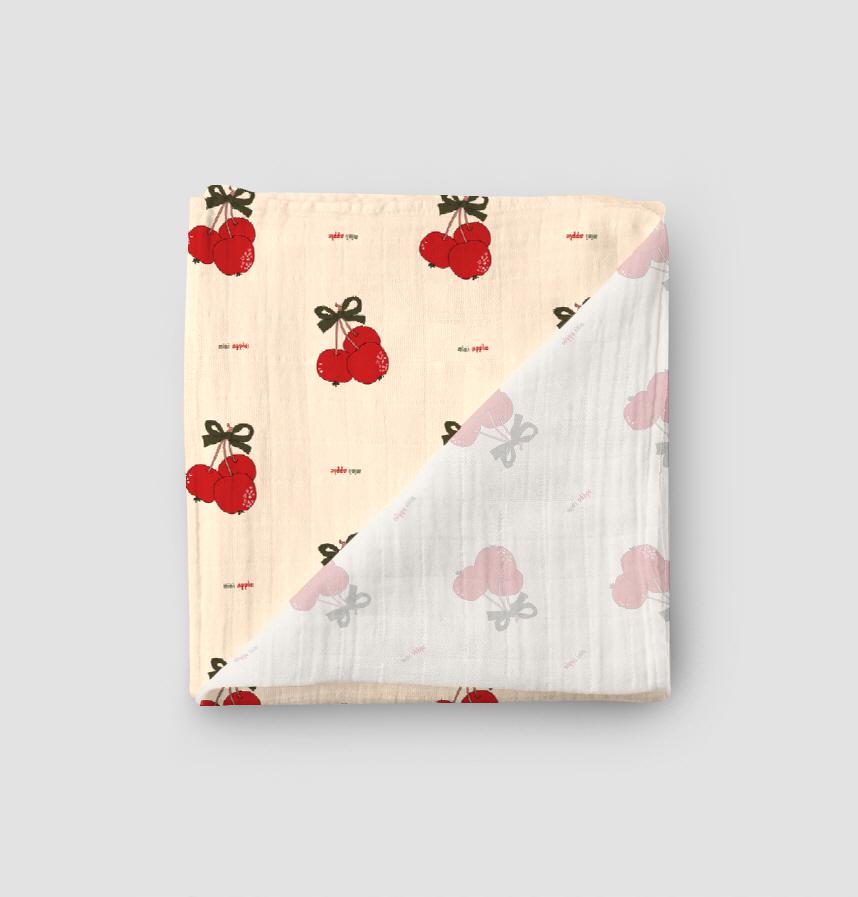 ミニりんごにリボンをつけてもっと可愛くて手書きも書いてみました。赤ちゃんの服、布団、小物はどこにもよく合います。