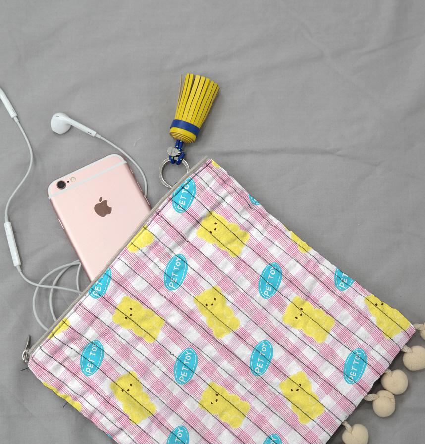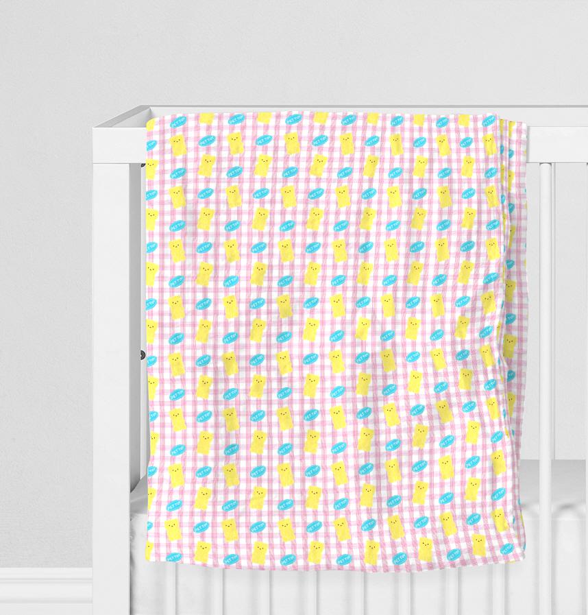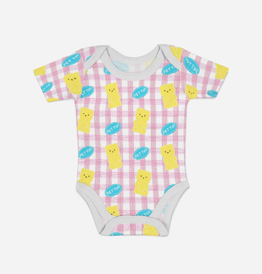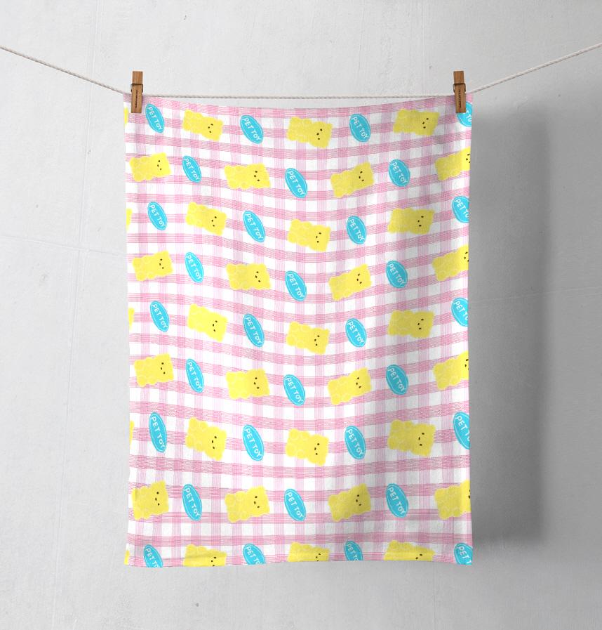 ペトイの中の黄色いクマ人形を可愛く描き、ピンクトンのチェック柄と加えて可愛く爽やかさを込めました