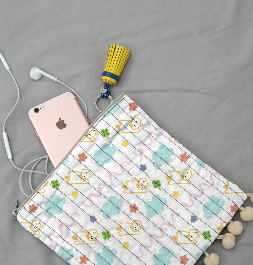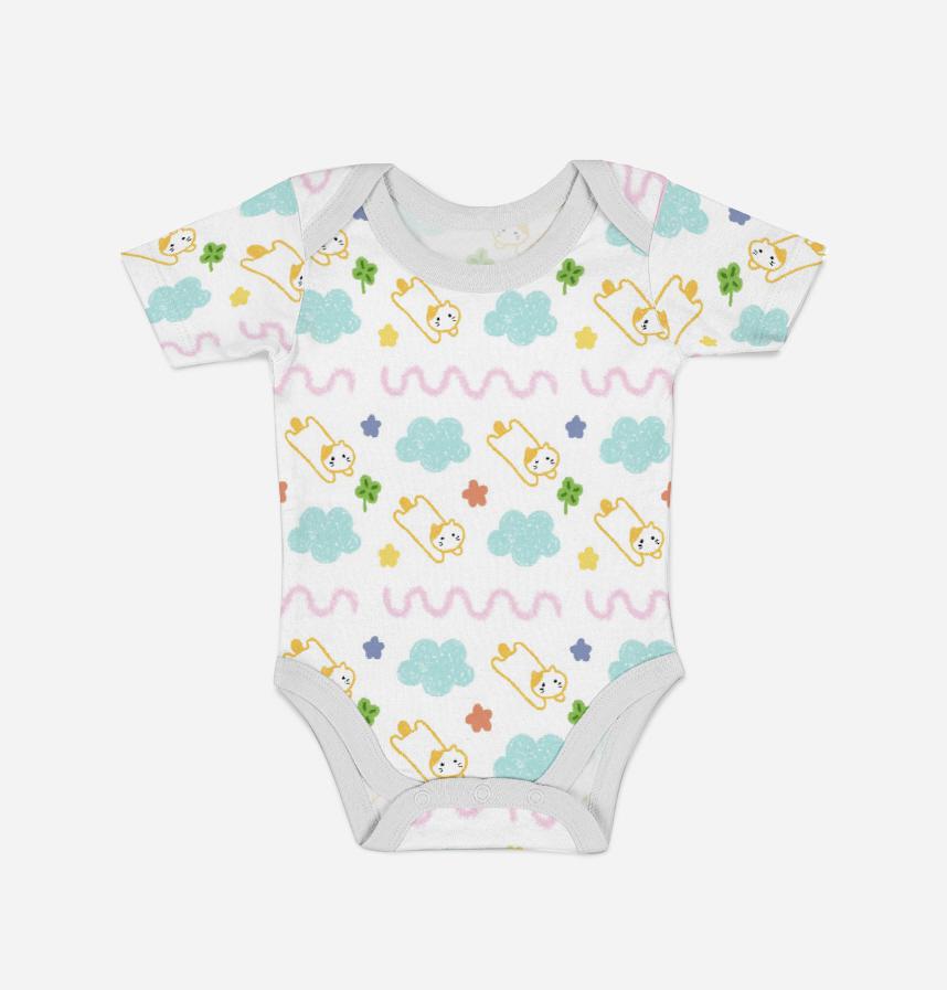 パターン説明 猫が飛び回る姿と雲、そして幸運のネイプクローバーパターン
