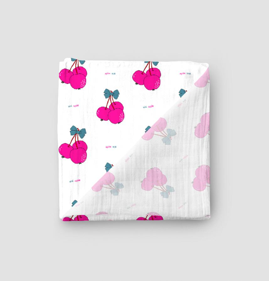 リボン付きのかわいいピンクのミニりんご、赤ちゃんの服や布団の小物などによく合います。