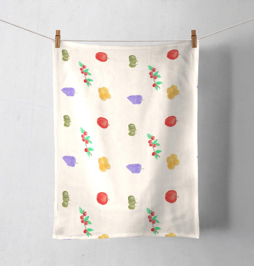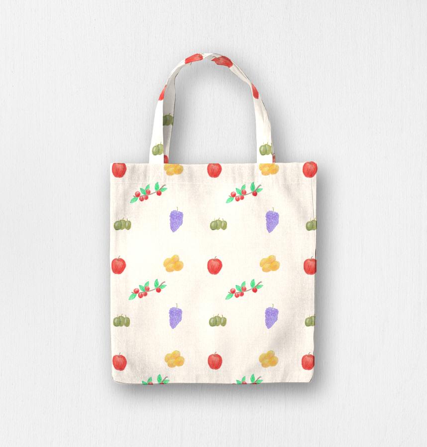 ブドウ、リンゴ、アンドゥ、キンカン、真鯛を色鉛筆で描いたパターン。