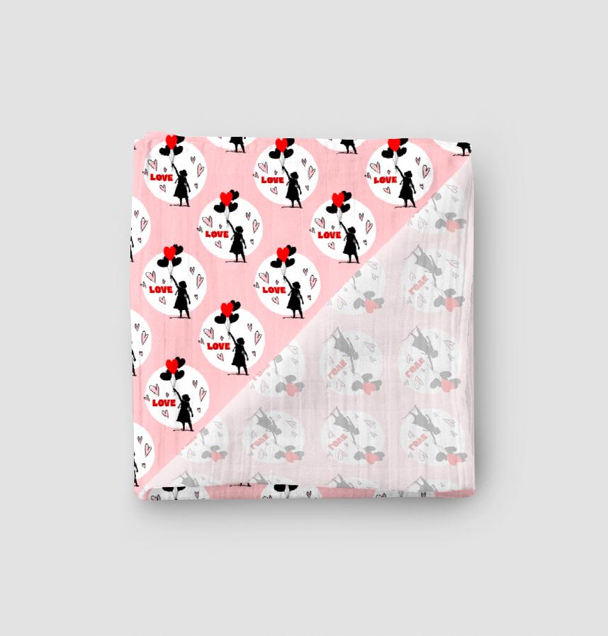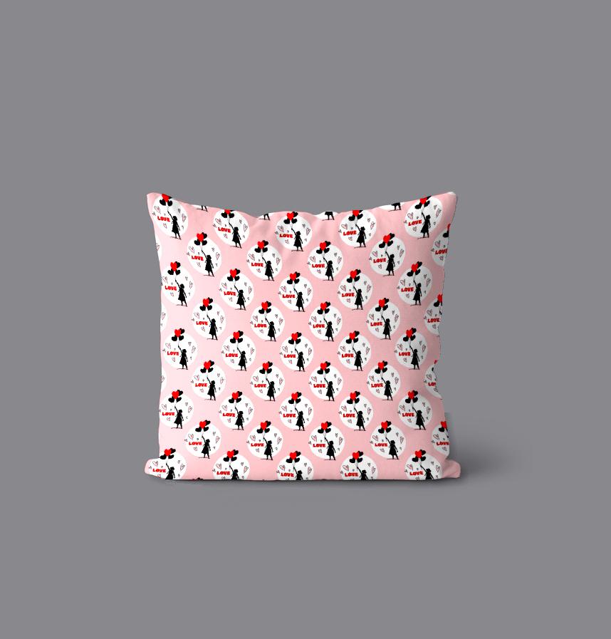 ハート風船を持つ少女とタイポグラフィを組み合わせたデザインパターンです。