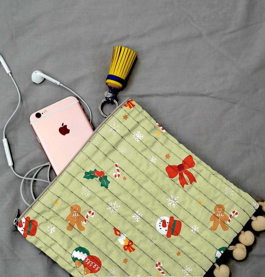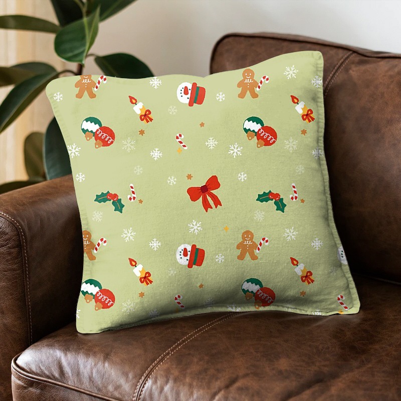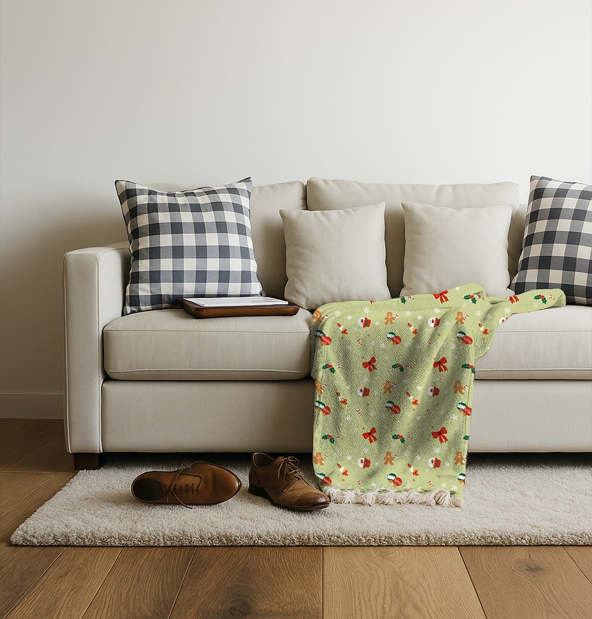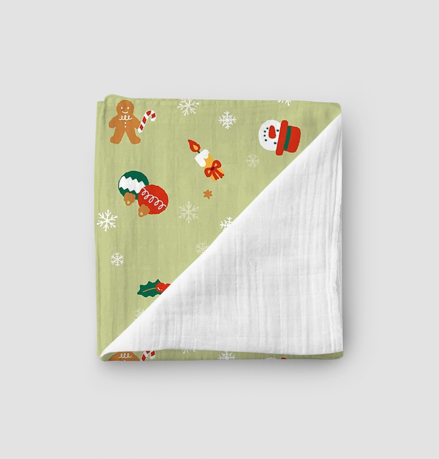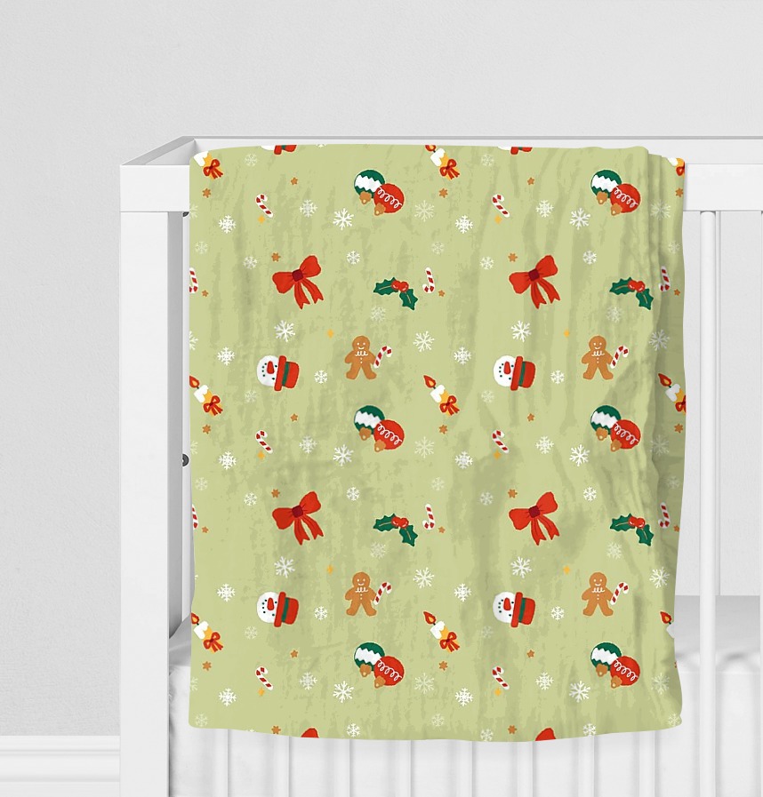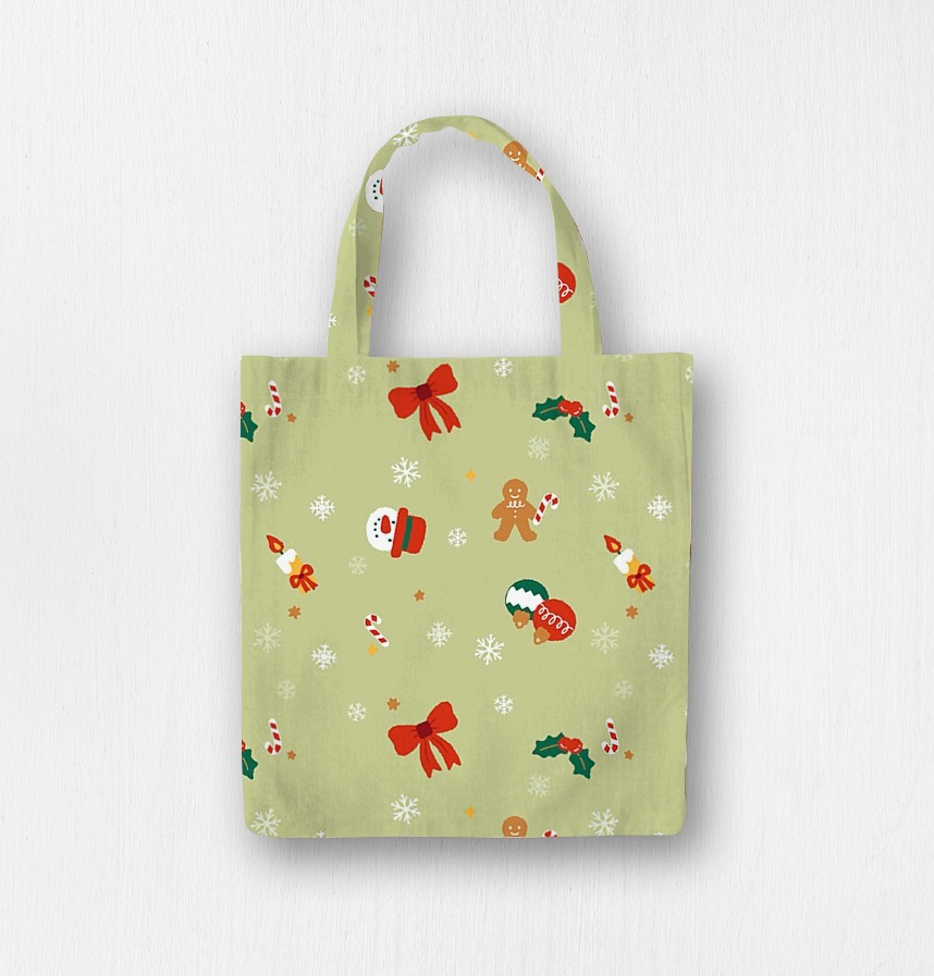 パターン説明 かわいいクリスマスパターンで暖かい冬の過ごし方~計25cmの大きさが繰り返されるパターンで、赤いリボンの部分の大きさは約5x4.6cmです。