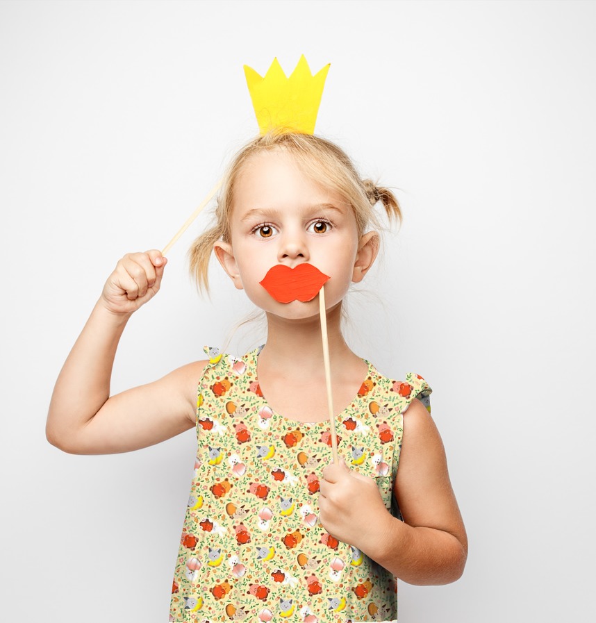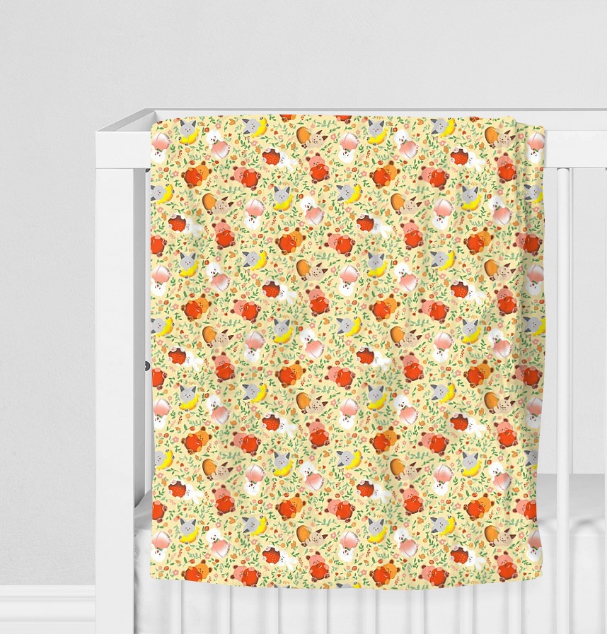 パターン説明 フルーツをしっかりと抱いた動物のお友達と花びらが舞い散る、愛らしいキッズオールオーバーパターンです。