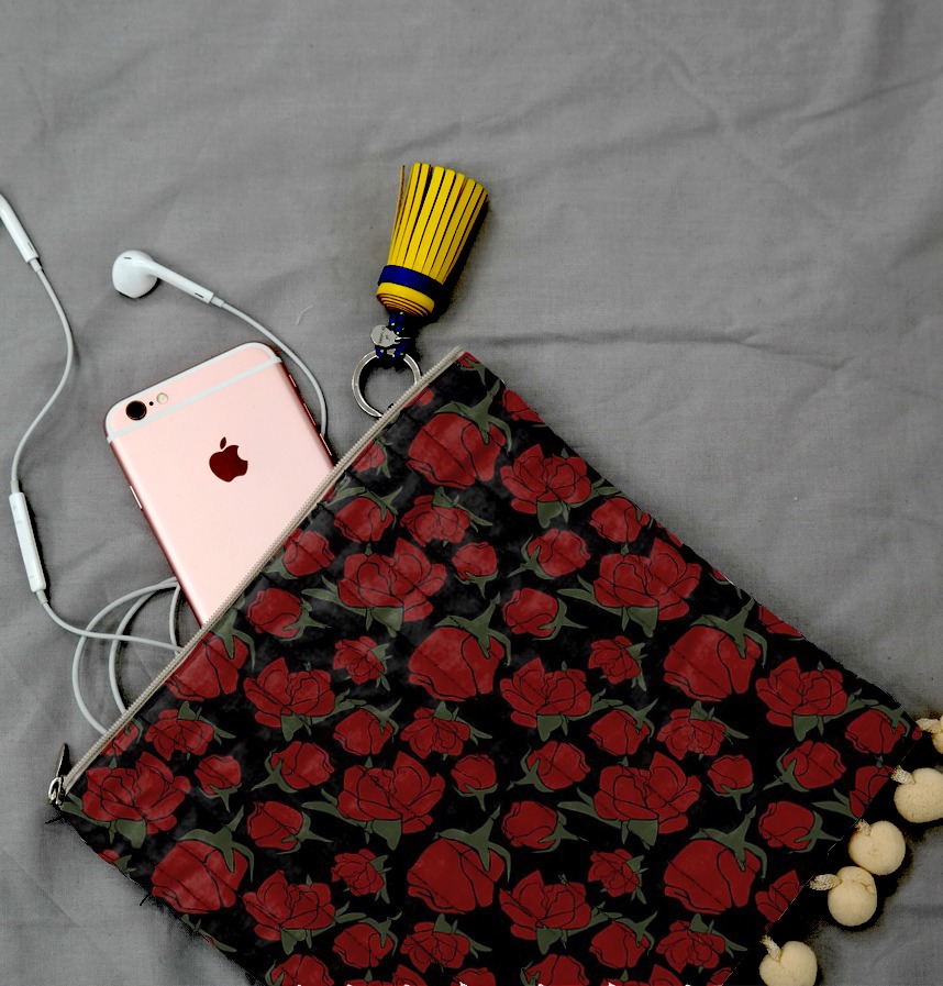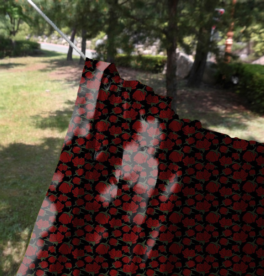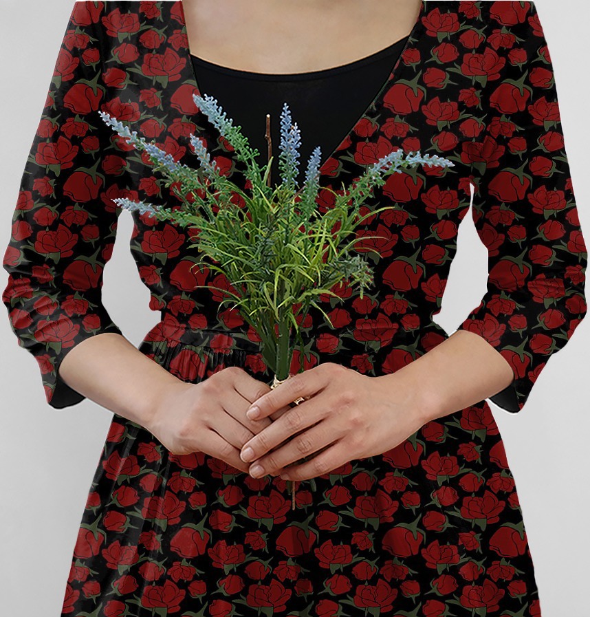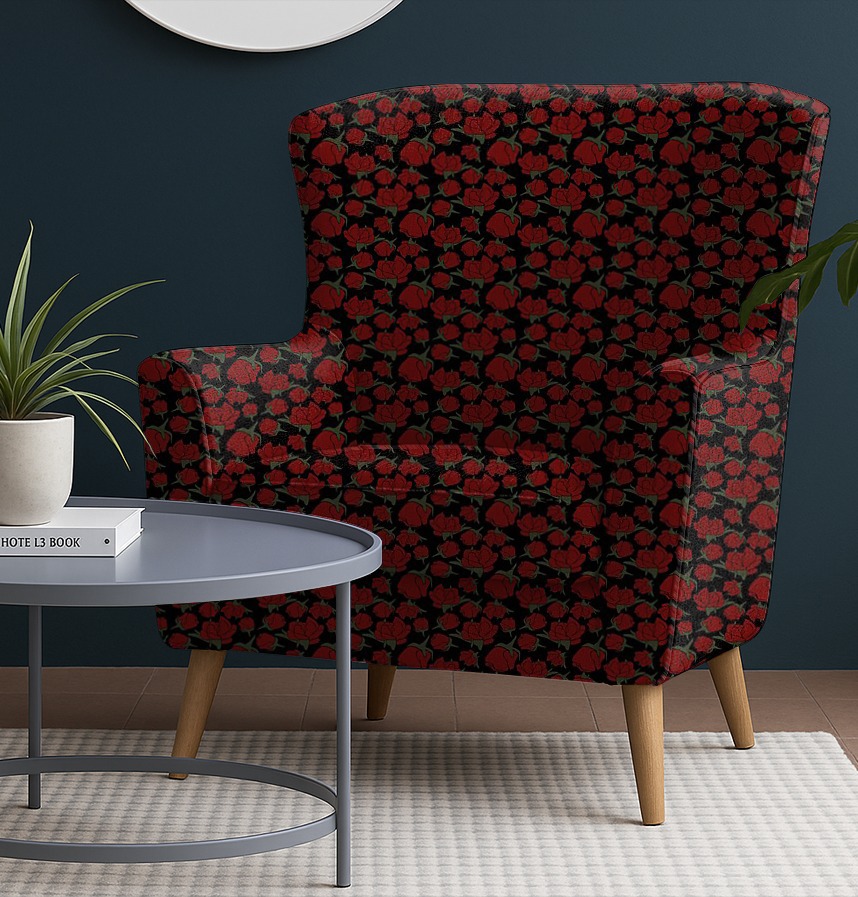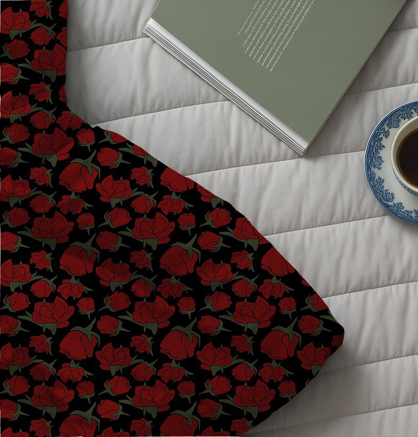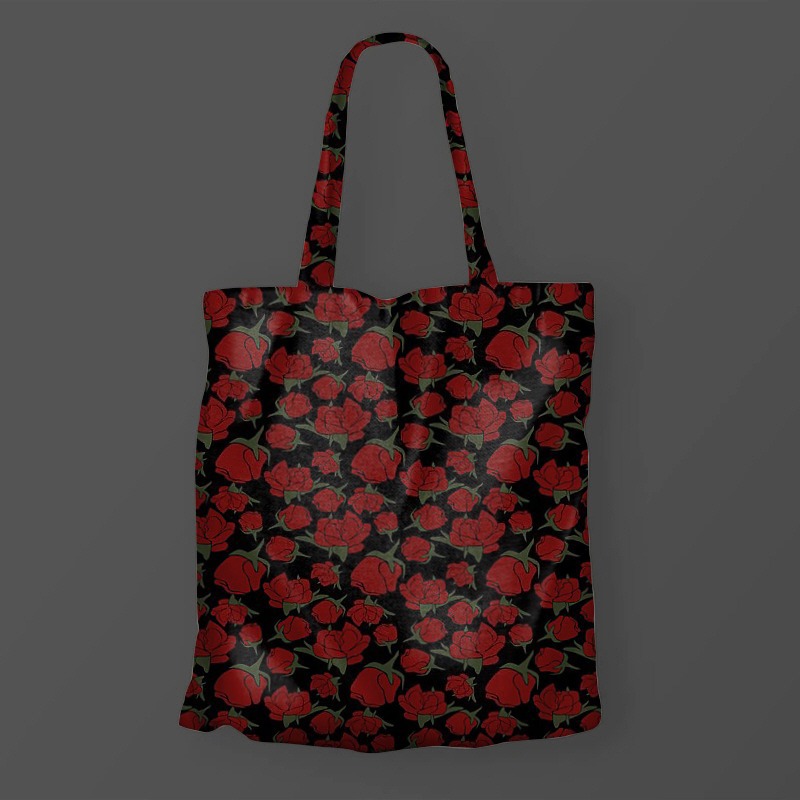 濃い赤色のバラが黒い背景の上に繰り返し配置され、豪華でロマンチックな雰囲気を醸し出すパターンです。自然と愛の美しさを表現し、優雅さと暖かさを同時に込めたデザインで、強烈な色味が視線を引き出してお洒落な印象を与えます。