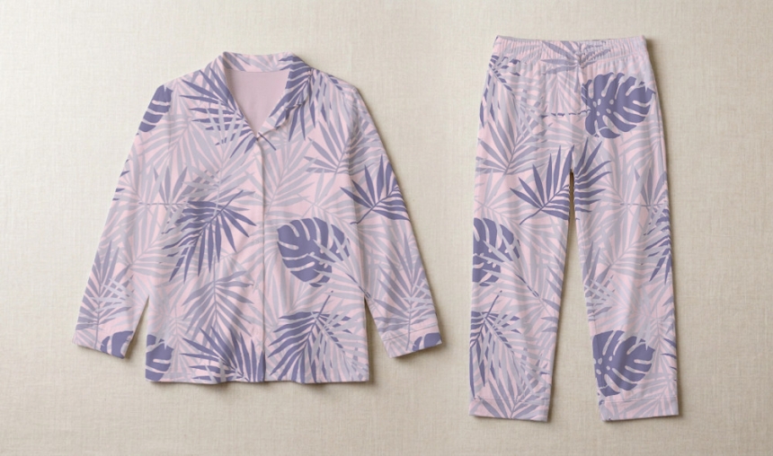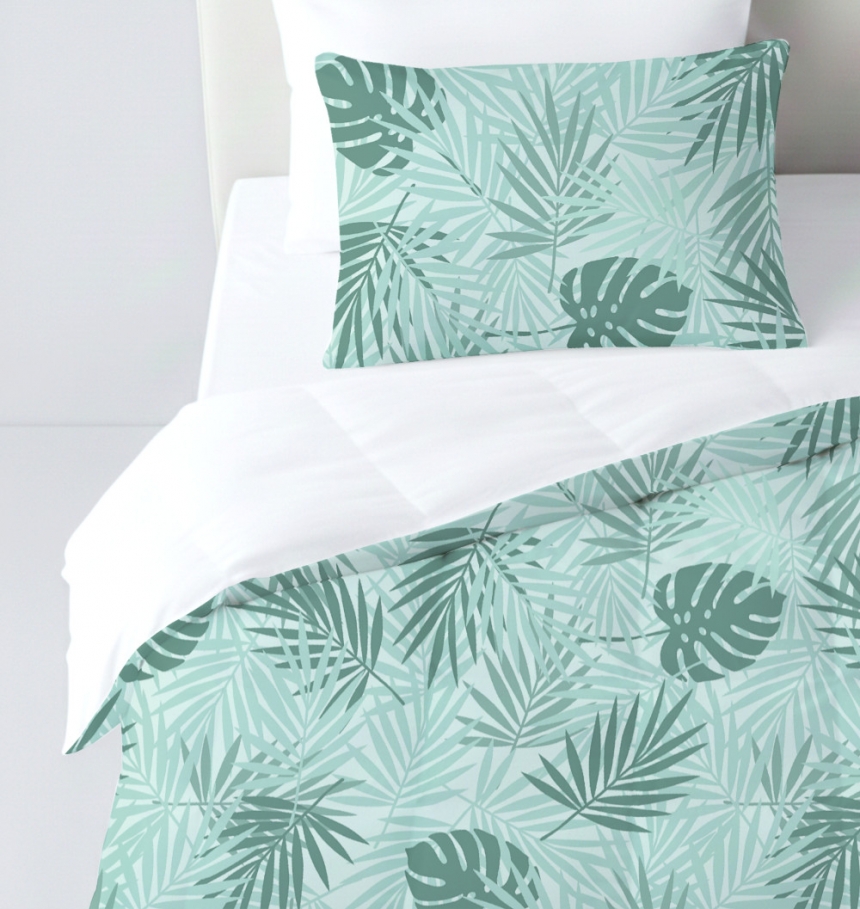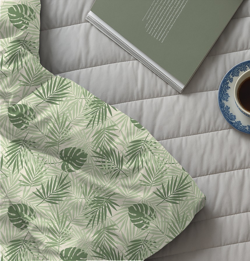 パターン説明 パステルトーンの柔らかな色合いと熱帯植物をレイヤーに重ねて構成したパターンです。
