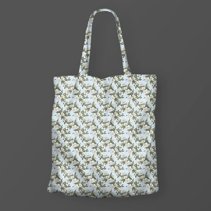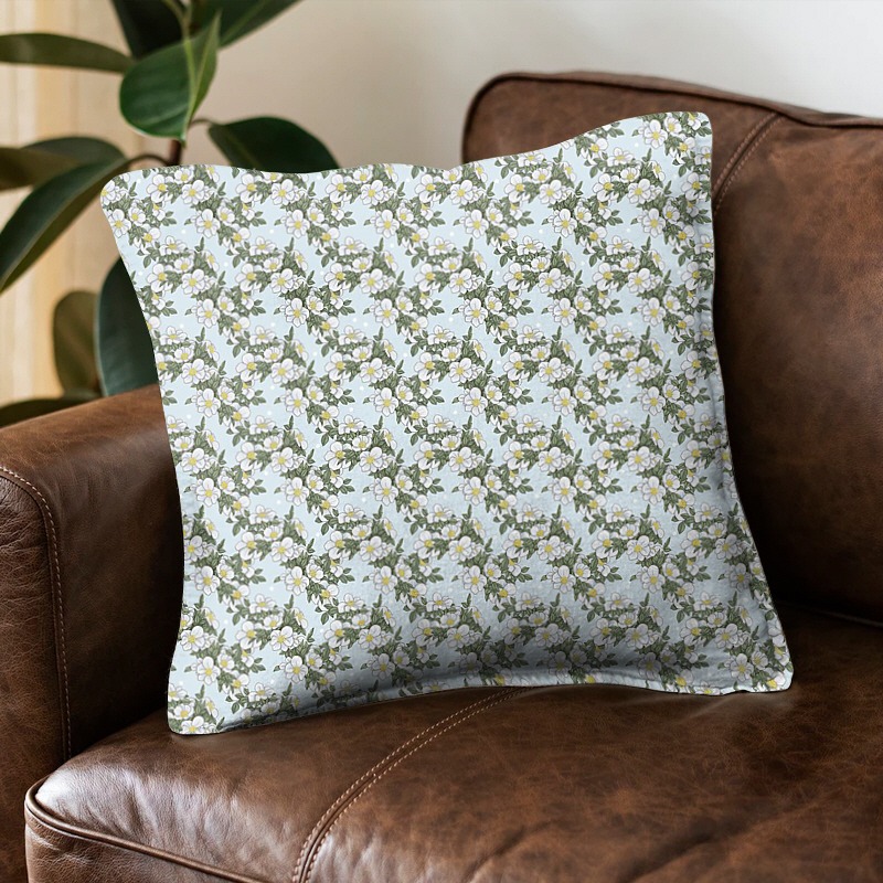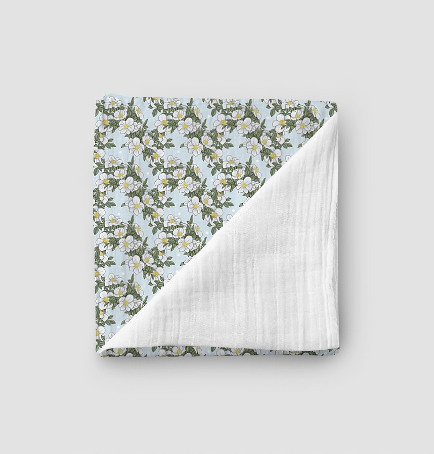 パターン説明 ほのかなスカイブルーをベースに白い水玉模様とクラシックな白い花房が調和を成すボタニカルデザインです。