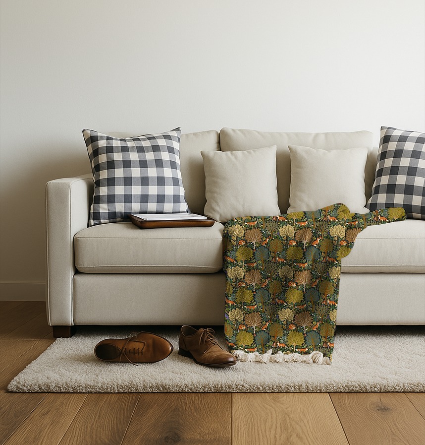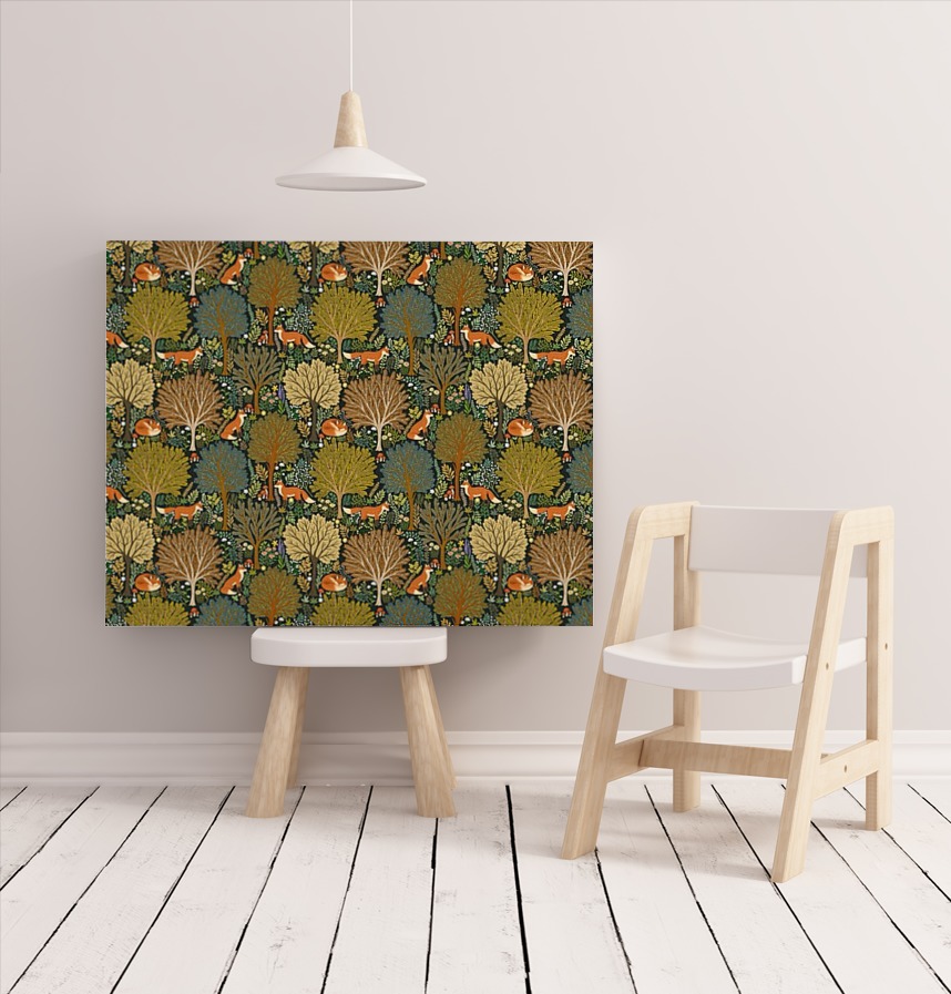 パターン説明 このパターンは北欧感性の童話的な森を背景にキツネと多様な植物が調和したイラストパターンです。