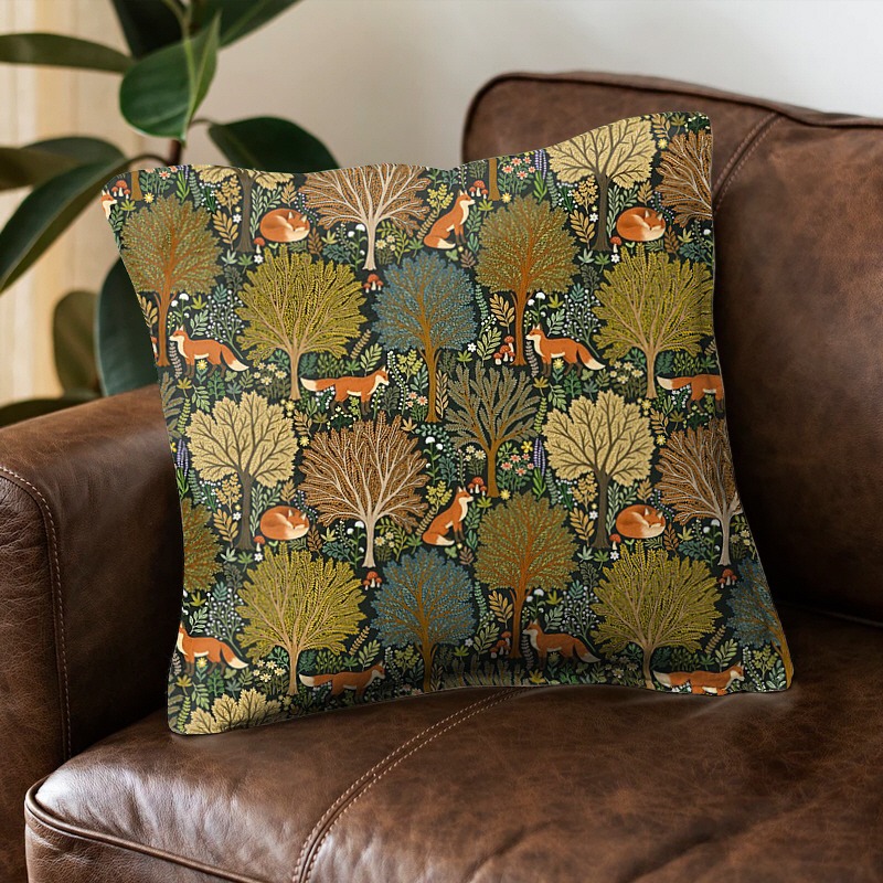 暖かいオレンジ色のキツネや木、野花、キノコなどがぎっしりと配置され、自然の躍動感と温かい雰囲気を同時に伝えます。