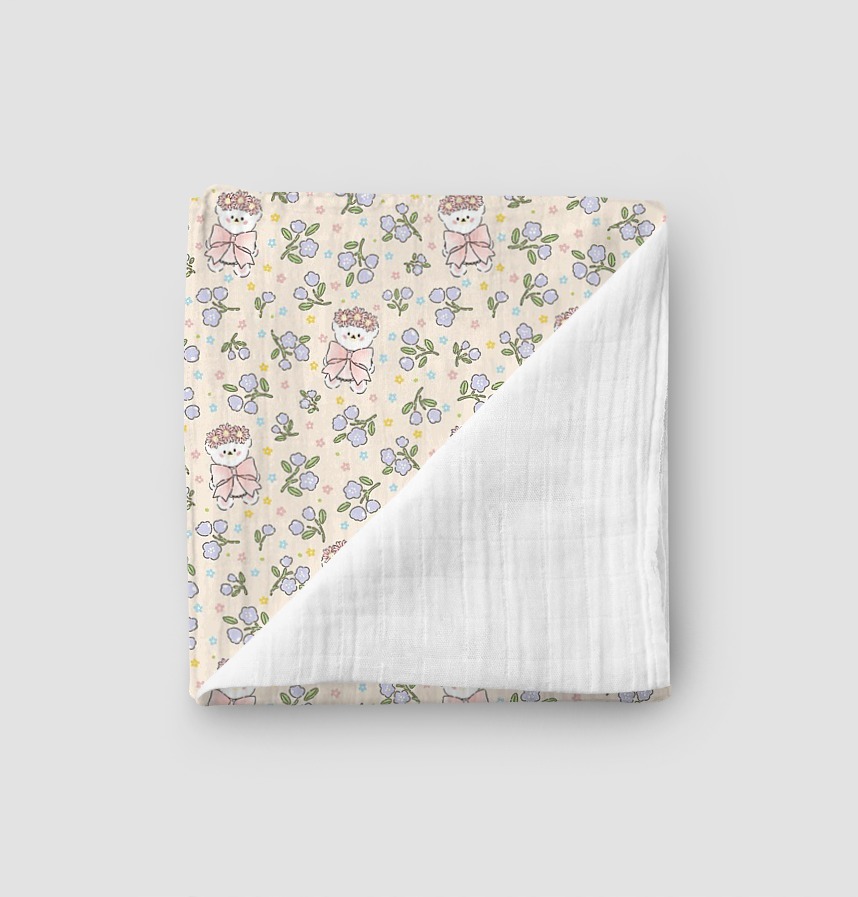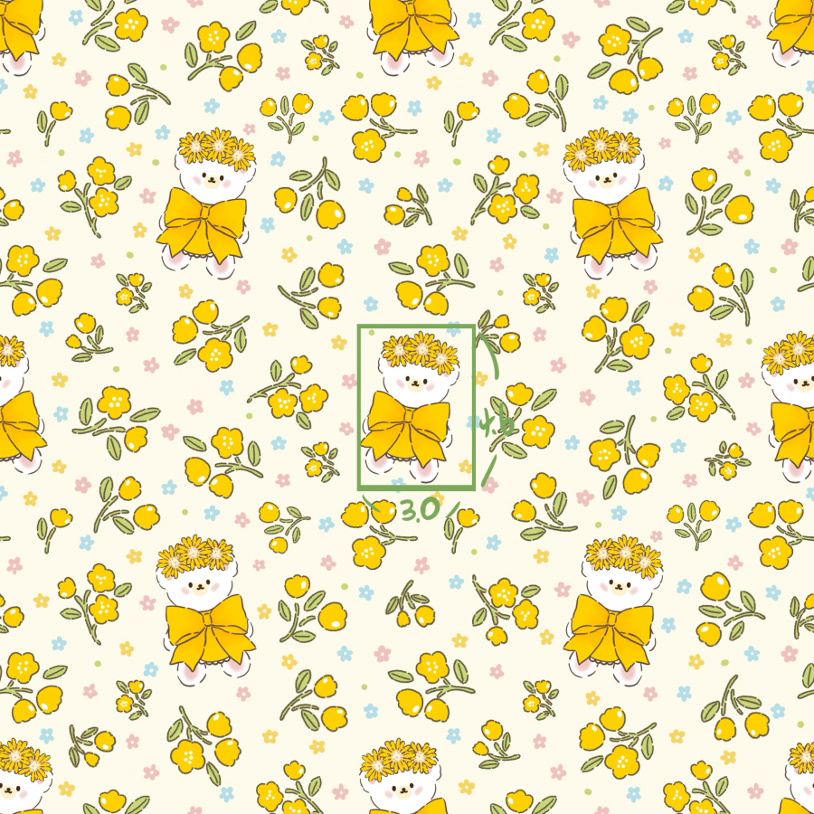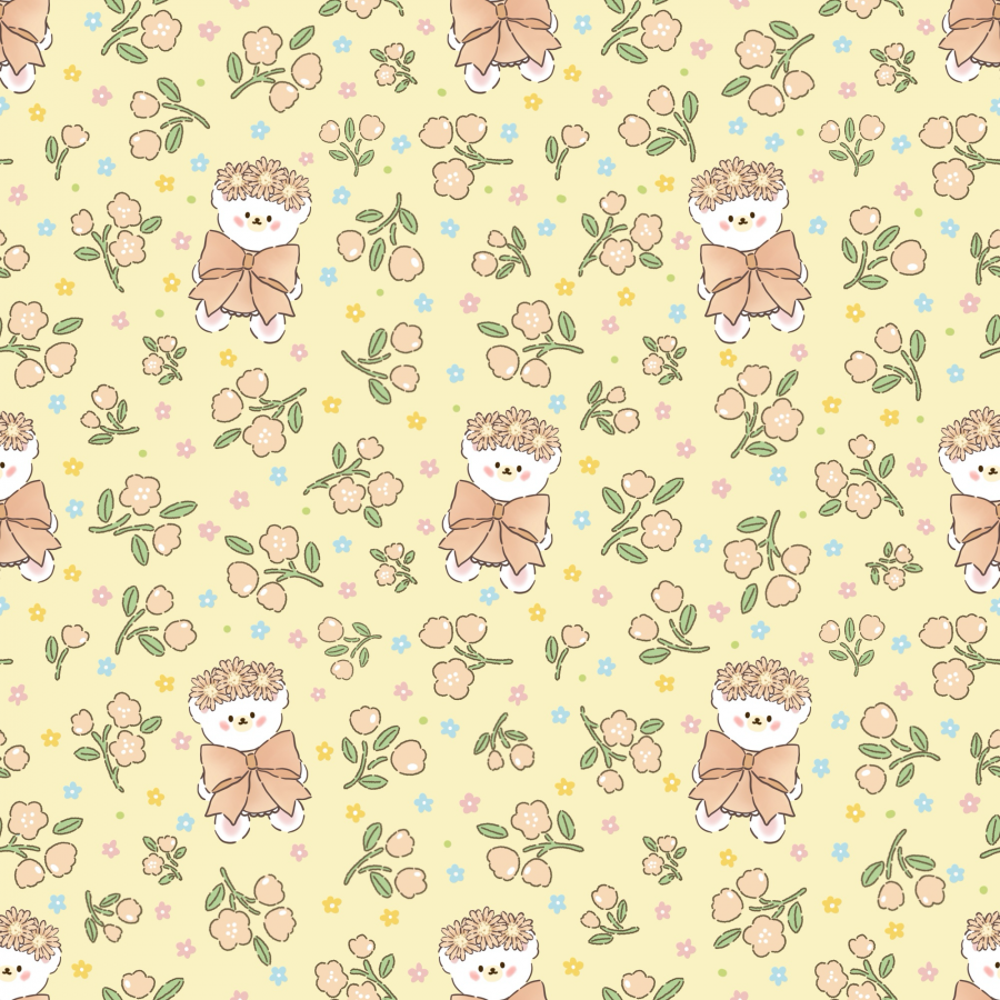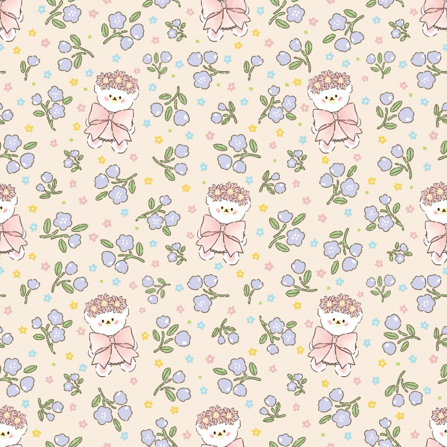 パターン説明 花冠をかぶった愛らしいクマと穏やかな花が調和したハンドメイド感性のパターン