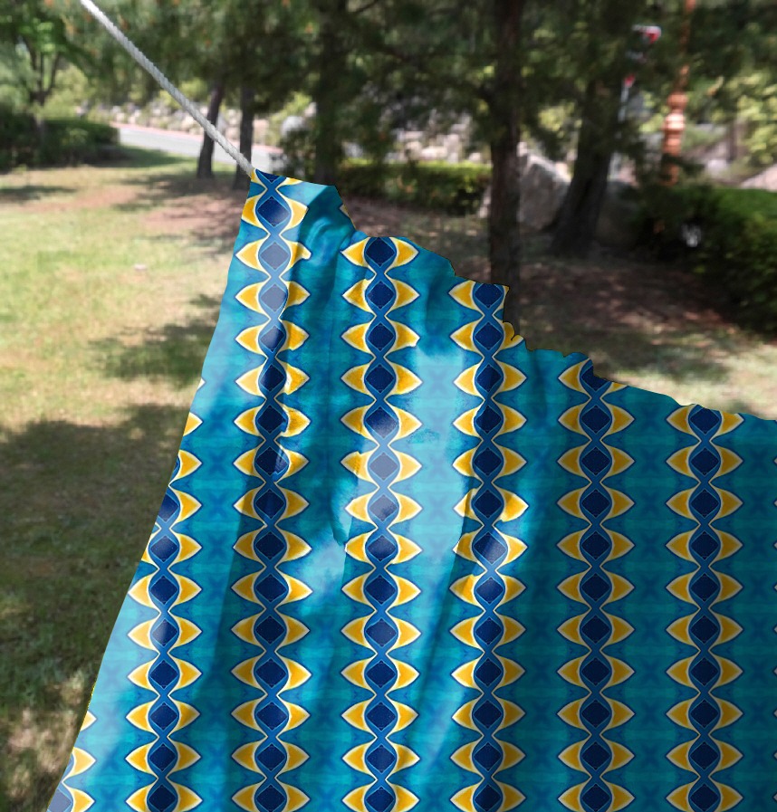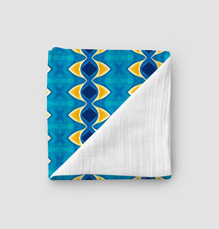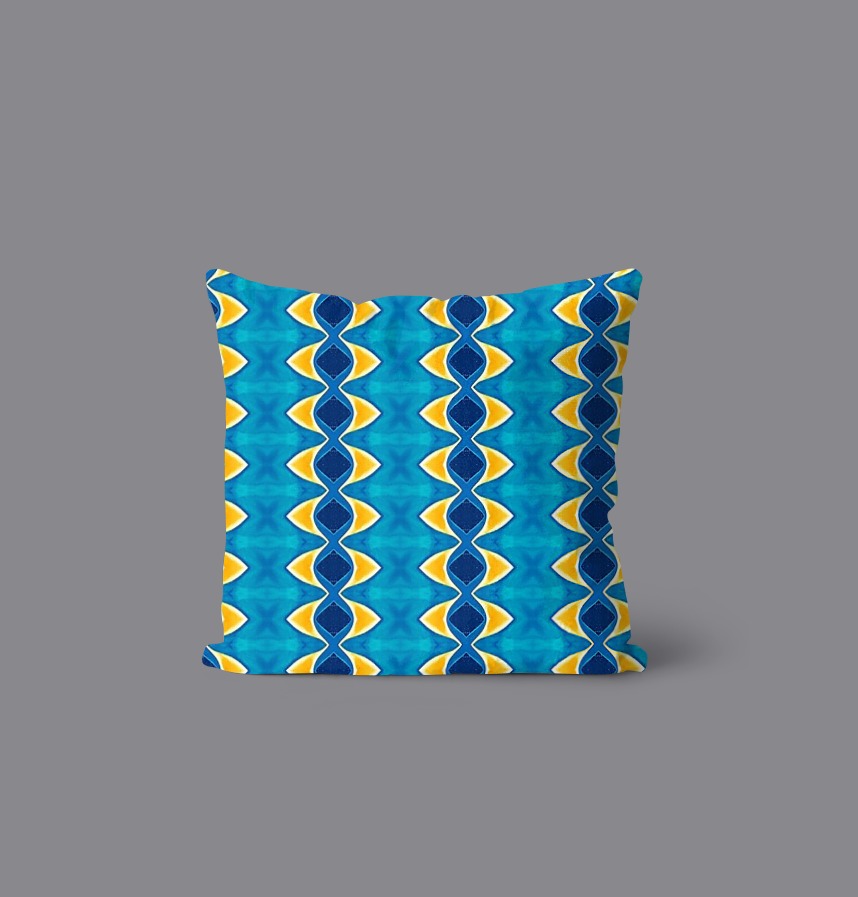 パターン説明 青と黄色が調和を成す華やかな模様のパターンクレパスと水彩画など多様な質感を活用し、夏の海が連想される涼しい感じの反復的で対称的なパターン