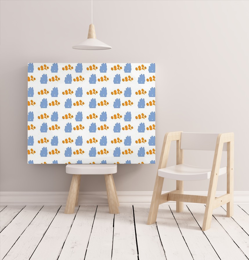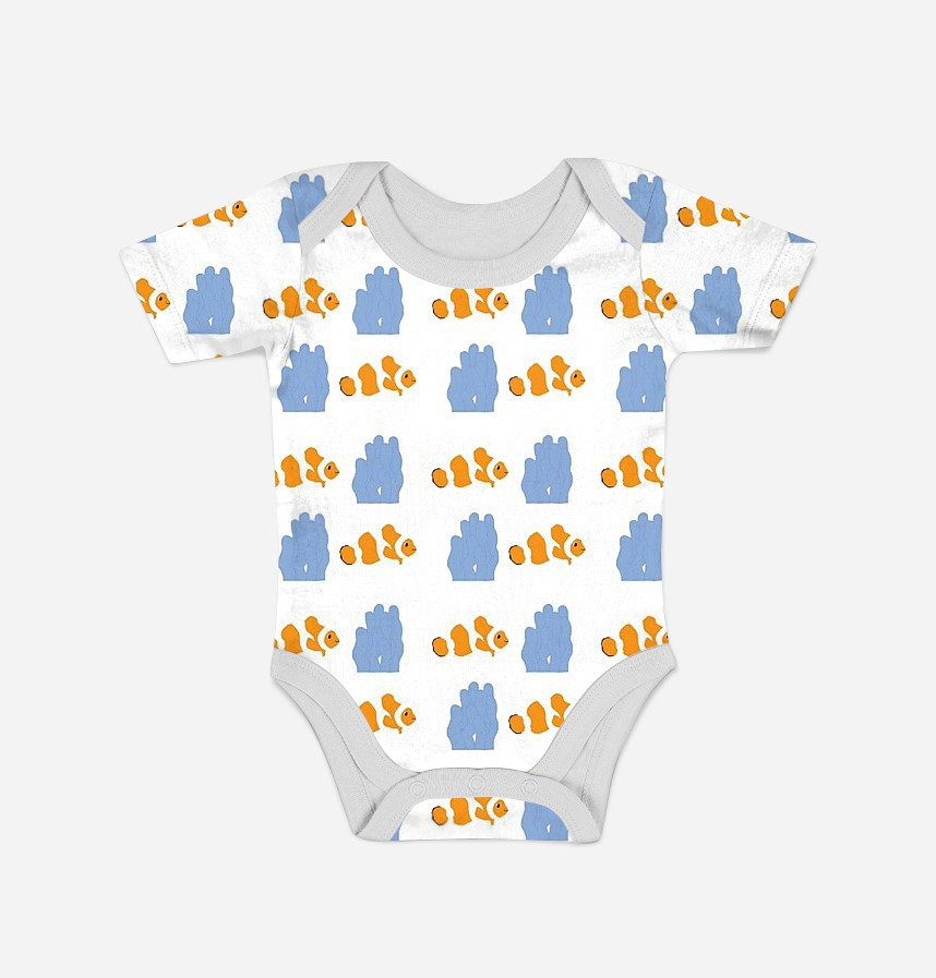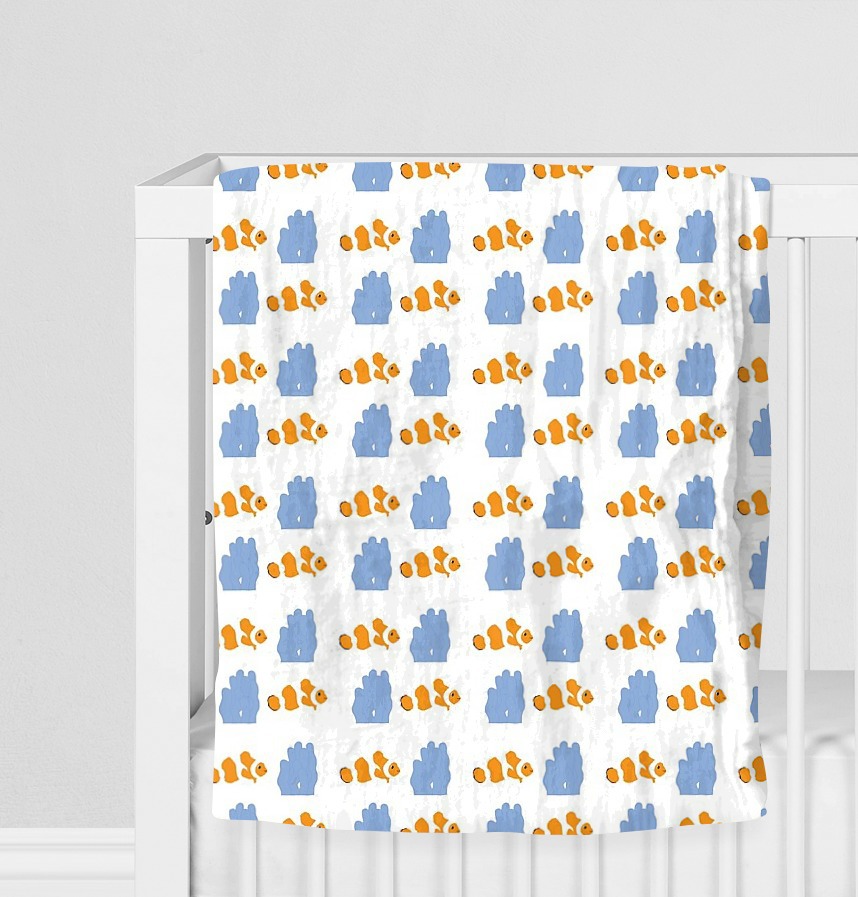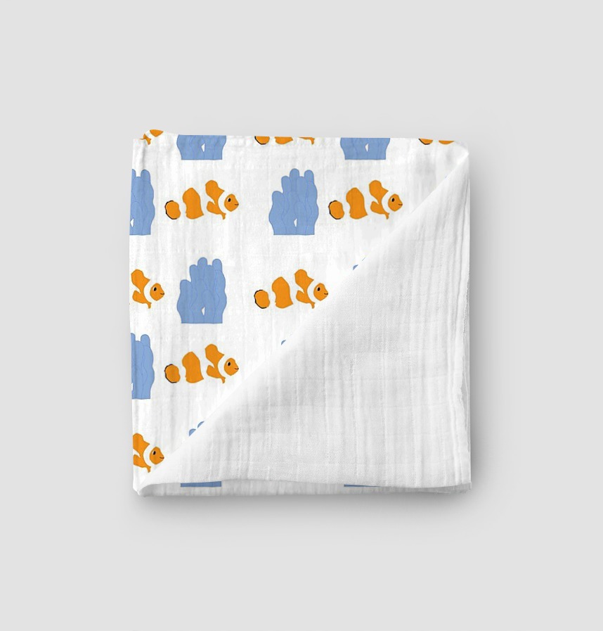 パターン説明 クマノミの魚と青いイソギンチャクが描かれたかわいいパターンです。 キッズ小物によく似合うパターンデザインです。