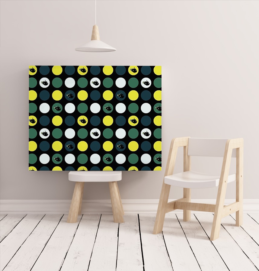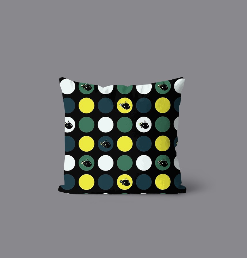 チョウチンアンコウのシルエットを、整然と並んだ大きなサークル(円)の中に配置した、リズム感のあるデザインです。黒の背景(漆黒)に、ビビッドなイエローと深みのあるグリーン、ネイビーを合わせることで、深海の神秘さと都会的なお洒落さを両立させました。コントラストが強いため、遠くからでも柄がはっきりと分かり、作品の主役になれるテキスタイルです