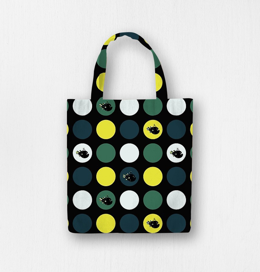大きなサークル模様は、バッグのポケットなどの小さなパーツに裁断しても、必ずどこかにアンコウや鮮やかな色が顔を出すよう設計されています。