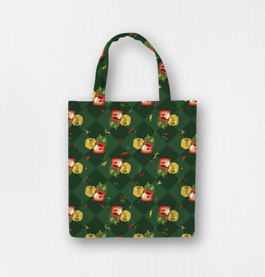 パターン説明 3色のパプリカと花火のモチーフを加え、軽快で活気のある雰囲気を盛り込んだパターンです。アーガイル構造をベースに規則正しいリズム感を生かしながらも、有機的な形が調和し、躍動感のあるデザインに仕上がっています。