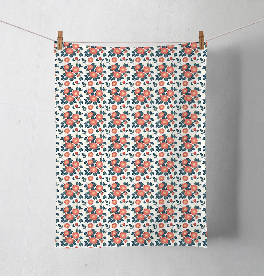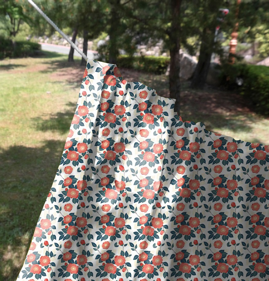 パターン説明 濃い緑色の葉と鮮やかな赤い花びらの対比を極大化しました。 花の雄しべの部分に金色のラインを加味して高級感を加え、不規則なように秩序よく配置された茎がリズム感を作り出します。 背景のほのかなベージュトーンは、やや強烈なレッドカラーを優しく包み込み、ふんわりとした温かいムードを演出します。