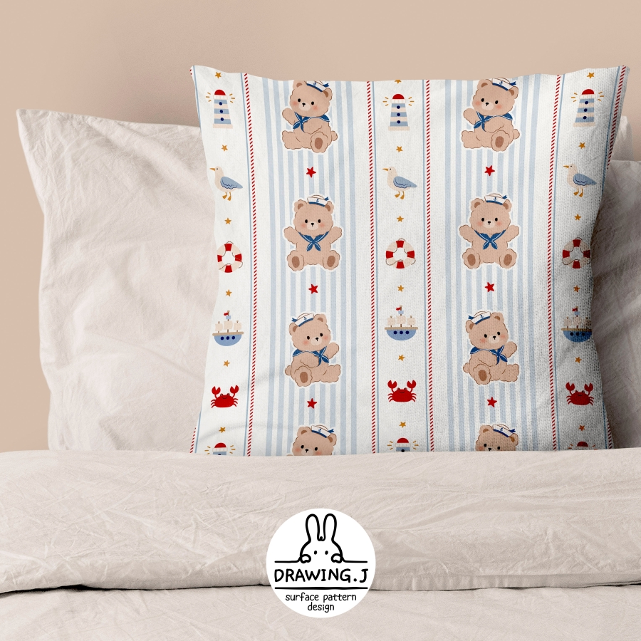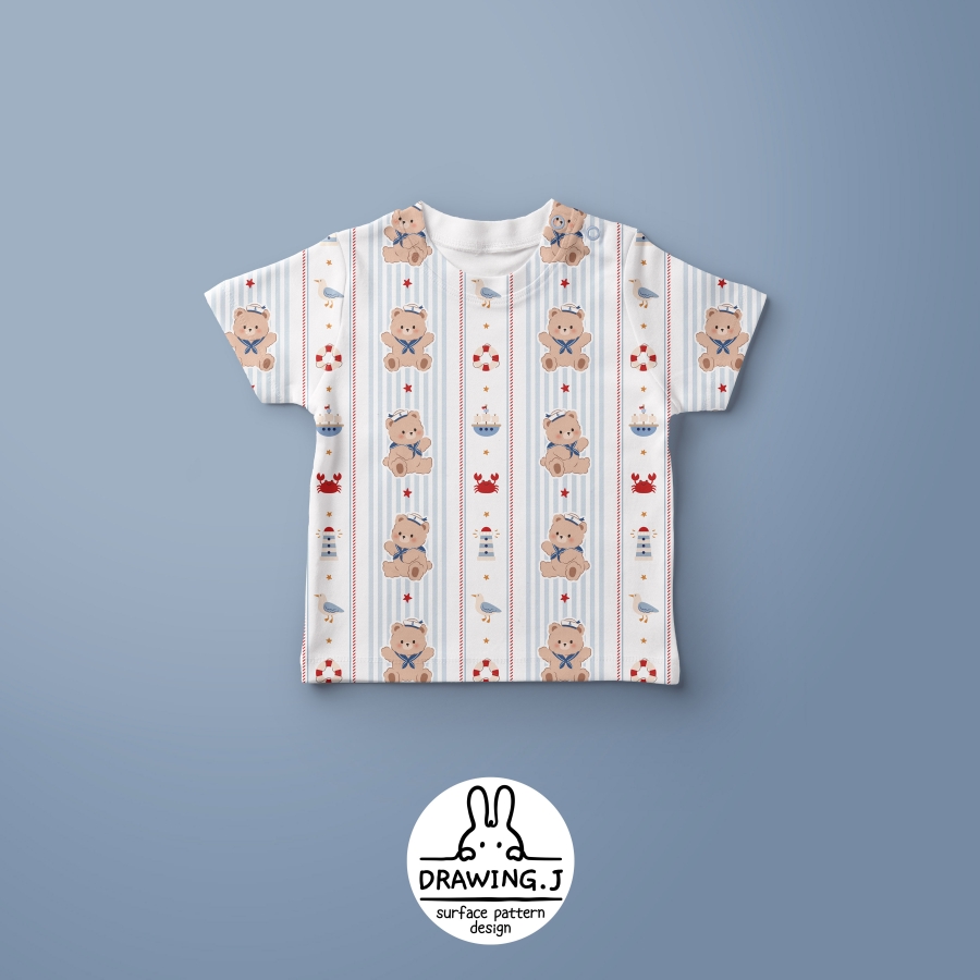 パターン説明 ストライプの背景に可愛いマリンテディベアと海洋モチーフが調和したパターンモチーフサイズ_テディベア基準