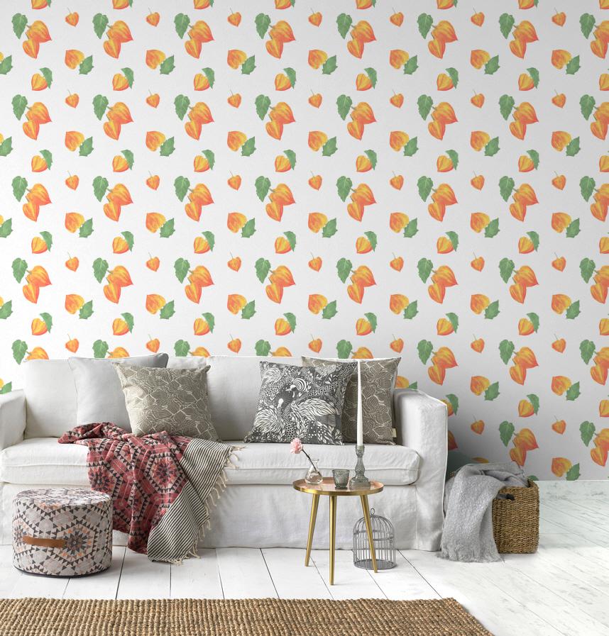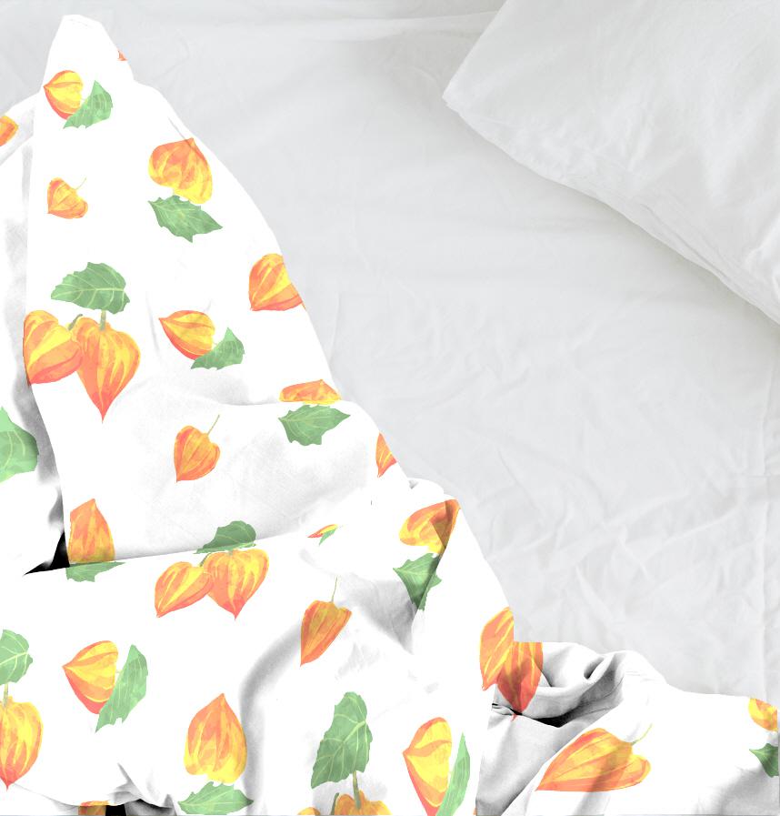 パターン説明 水彩風のほおずきを大柄の模様にしました。布団カバーなどにどうぞ。