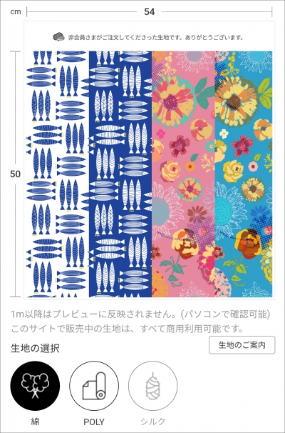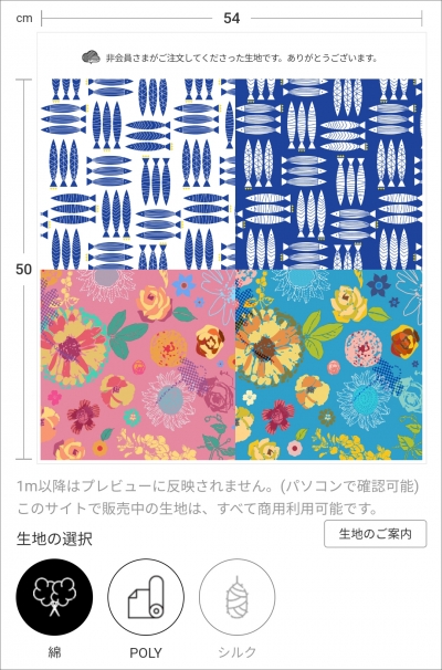 モバイル限定機能の「マルチプリント」は、 2種類または4種類のデザインをまとめてプリントできるサービスです。 そのため、別々にご注文されるよりもお得にご購入いただけます。 マルチプリントのご注文は、以下の手順で行ってください。 【マルチプリントのご注文方法】 ①スマホでサイト左上の「≡」に入る。 ![]() ②リストや検索結果からご希望のデザインを選択する。 削除する場合は、「選択されたデザイン」をタップする。 ③2種類または4種類のデザインを選択したら、「選択完了」をタップする。 ![]() ④ご希望のレイアウトを選択する。 ![]() ⑤生地の種類とサイズを選び、カートに入れてご注文手続きへ。 (サンプルサイズおよび1m以降の生地のサイズは、こちらでご確認ください。) ↓シーチング・サンプルサイズの場合 ![]() [ご注意事項] *デザインの拡大・縮小・回転はできません。 *マルチプリントはモバイルサイト限定の機能です。 *セール割引は適用外ですが、大量購入割引は適用されます。 *生地プリント(ファイルをアップロードしてご注文)には対応しておりません。 ↓デザインはつながっているので、カットしてお使いください。 ![]() |