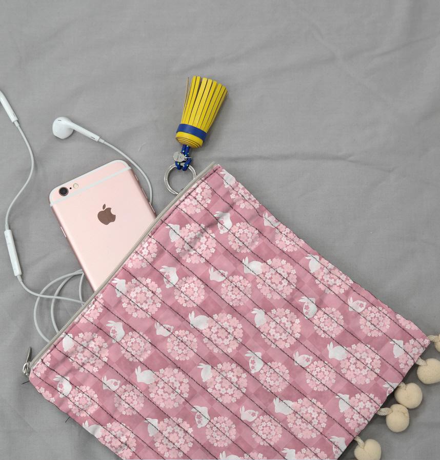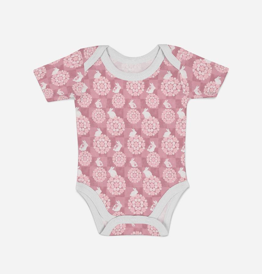 市松模様地に桜の花鞠とうさぎを遊ばせました。
