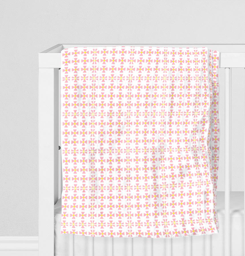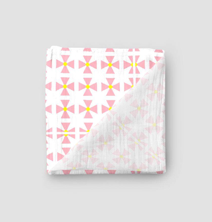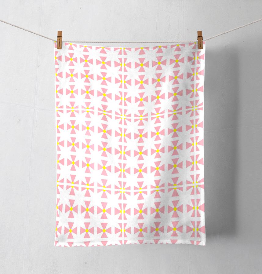 中央の黄色の円:パターンの中心に黄色の円があります。この円は、4つのピンク色の三角形が出会う地点に位置し、デザインの中心を強調します。黄色は明るく鮮やかな色で、デザイン全体に鮮やかな感触を加えます。