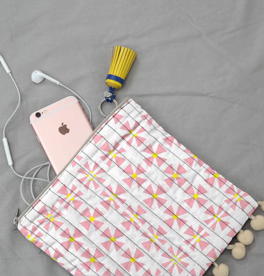 背景:パターンの背景は白で、ピンクと黄色の要素が際立っています。白い背景は全体のデザインをきれいでスタイリッシュな印象に仕上げます。