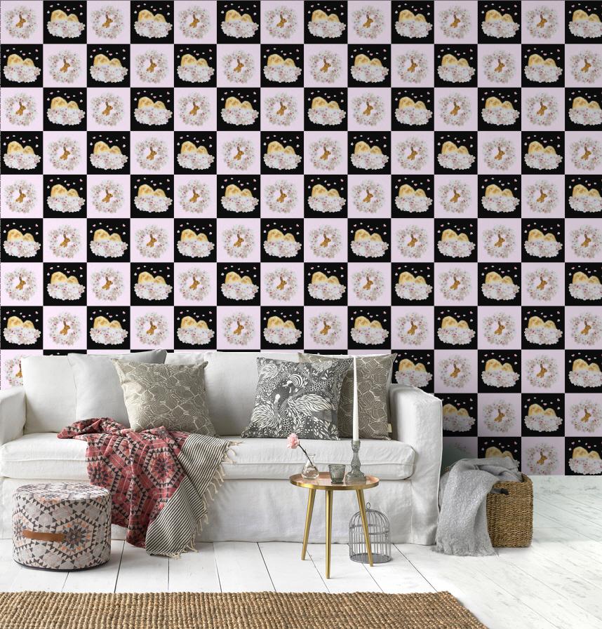 パターン説明 春をイメージした昼夜の桜とうさぎの生地です。