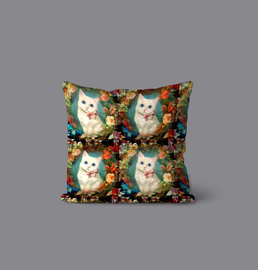 青い瞳の白猫とミステリアスなロココ調背景アート