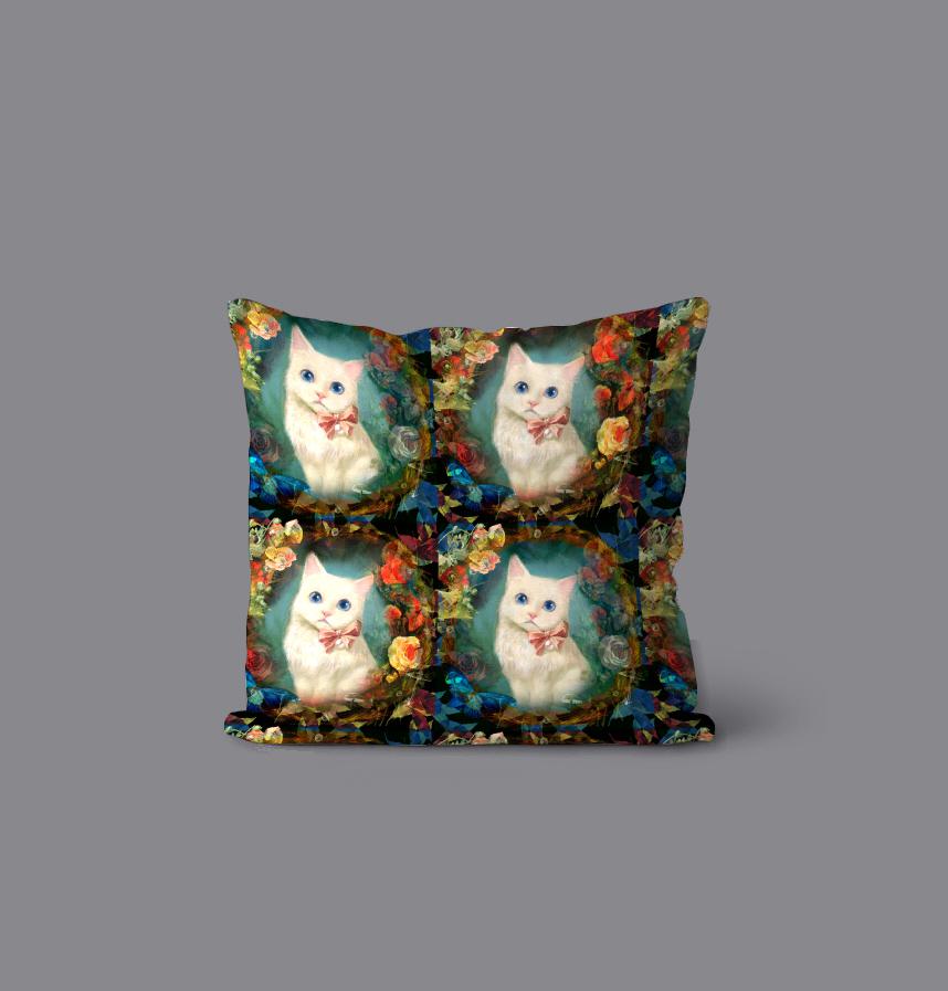 青い瞳の白猫とミステリアスなロココ調背景アート