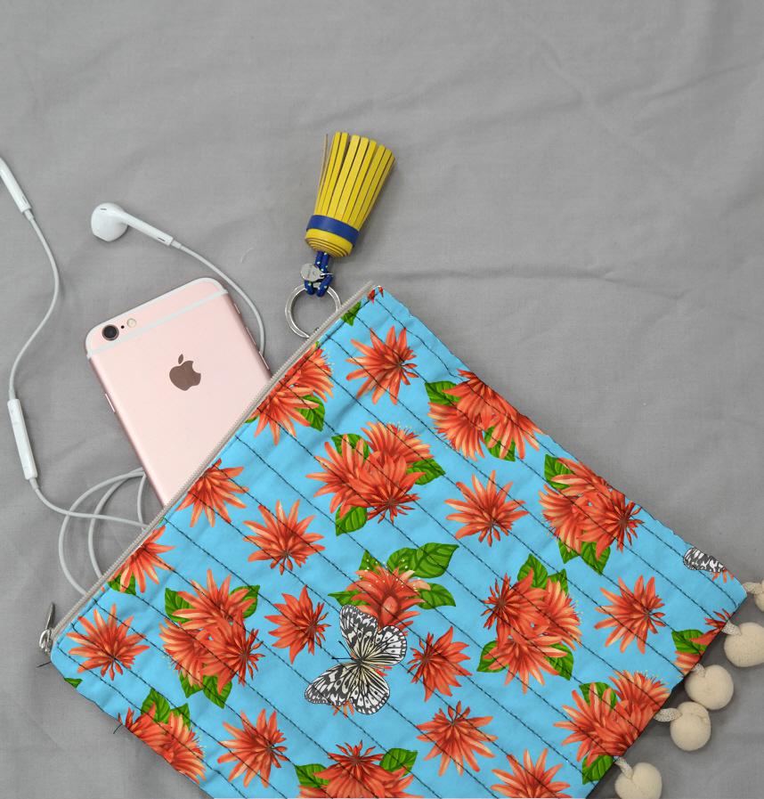 パターン説明 空のような青い背景にならぶ沖縄の県花デイゴと県蝶オオゴマダラのパターン柄です。