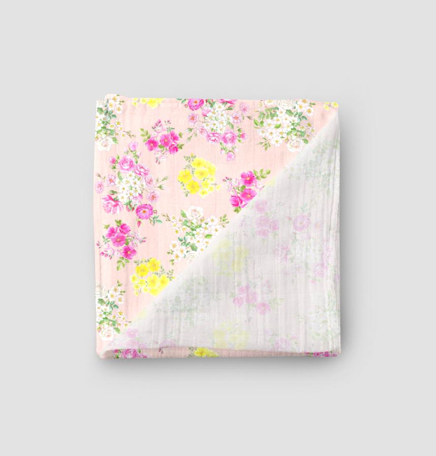 黄色、ピンク、白い花のブーケをランダムに配置しています。